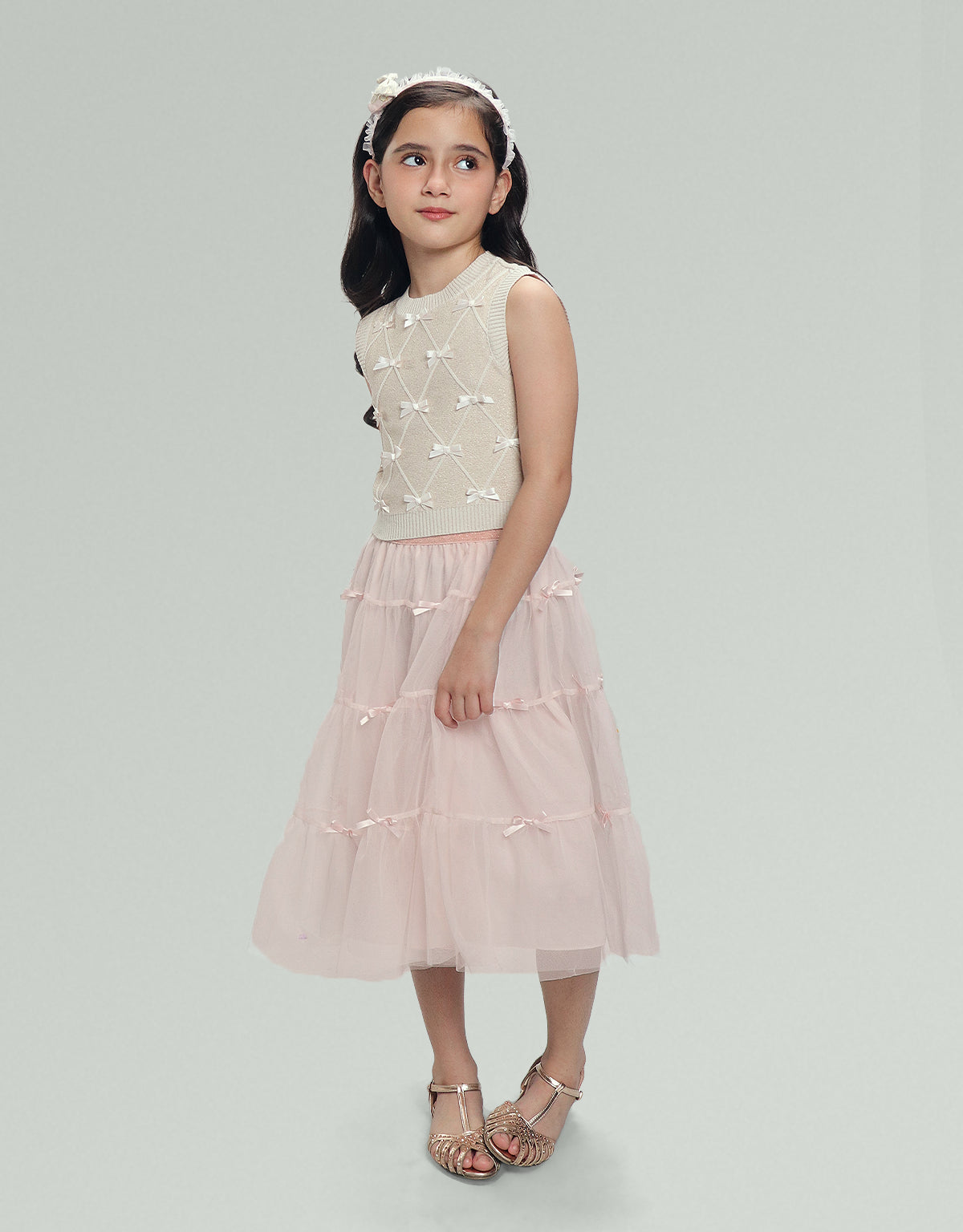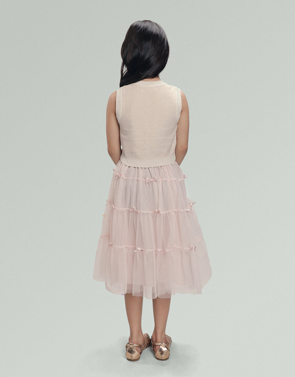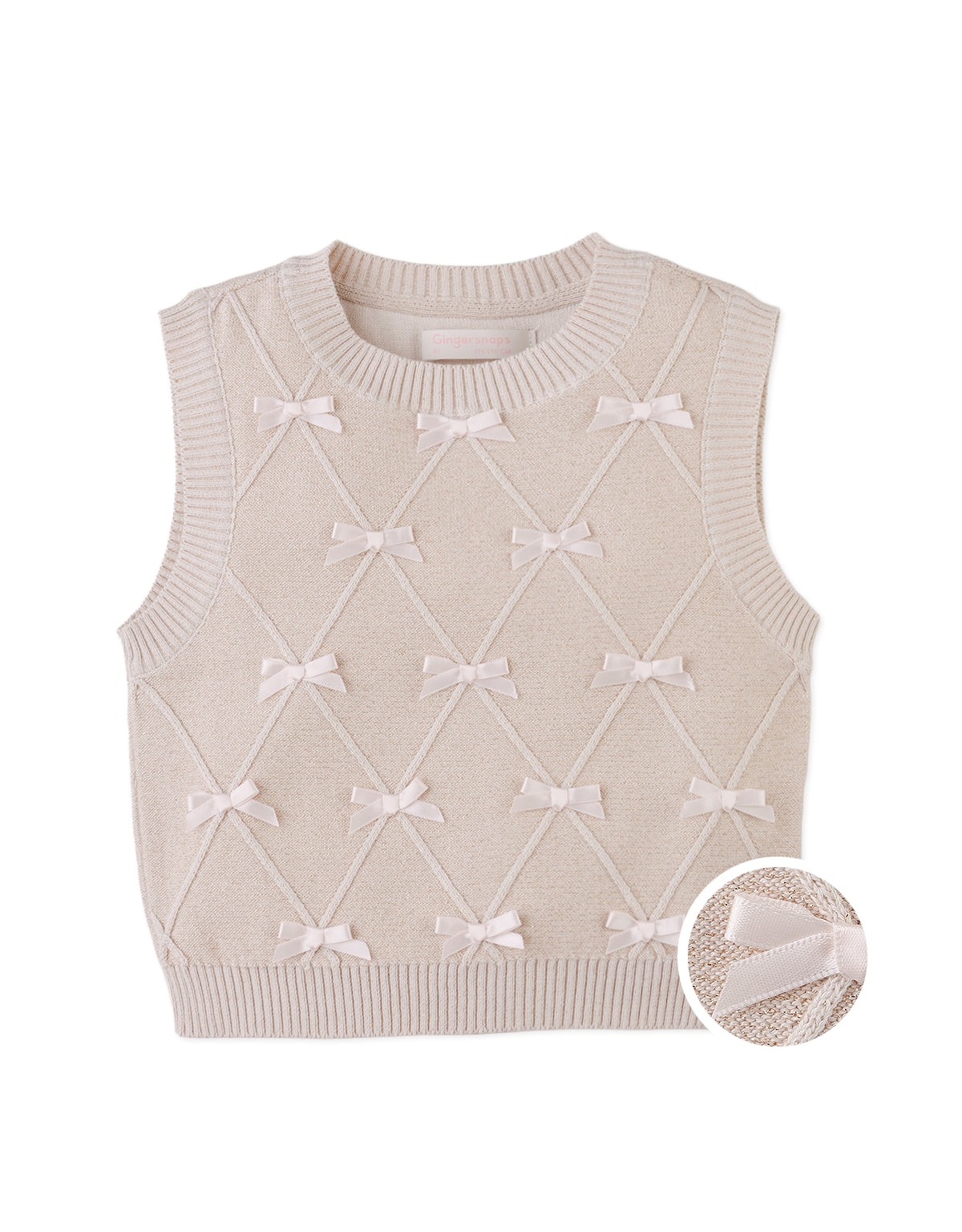 Add shimmer and charm with this Knitted Top. The gold lurex fabric and velvet bow accents make it a standout piece for celebrations, photos, or stylish layering.
