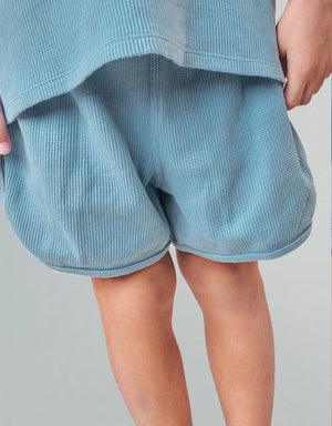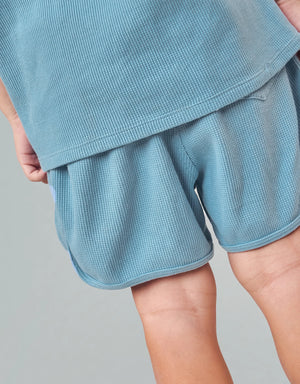 Made for your little athlete's ease of movement, these blue waffle knit dolphin shorts feature curved hems and an easy pull-on waistband, complete with a playful embroidered logo for a sporty finish.