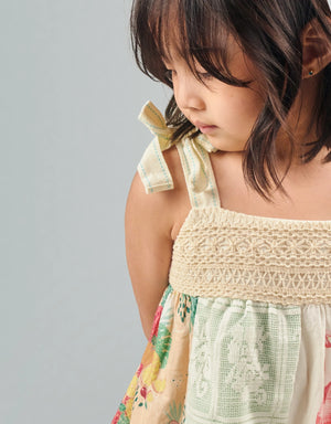 A lovable spin on classic gingham, this patchwork baby doll dress features soft cotton tie straps and contrast stitching. Light, breezy, and full of charm, perfect for sunny day adventures and twirls.