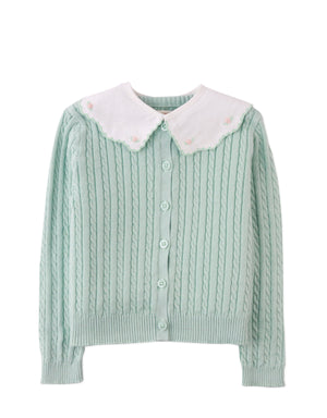 FRIDA CARDIGAN GREEN WITH BOUILLON EMBROIDERED CONTRAST COLLAR