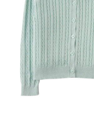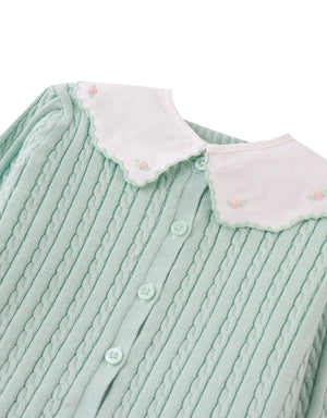 Classic style meets cozy charm with the Frida Cardigan in subtle green, featuring a bouillon embroidered contrast collar that adds a whimsical, rustic touch to your child's ensemble.