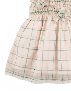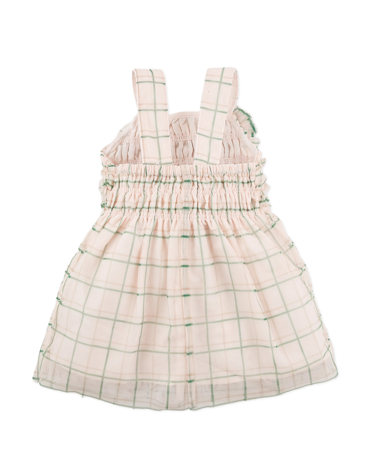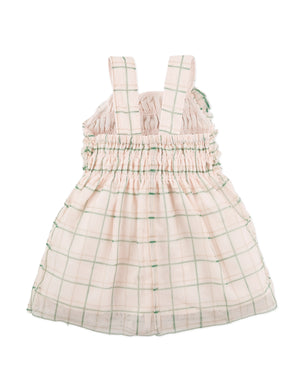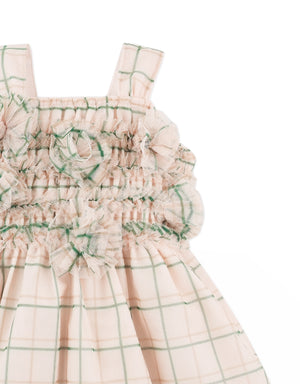 BABY JEANETTE SMOCKED DRESS PEACH GRID WITH FLOWER APPLIQUE
