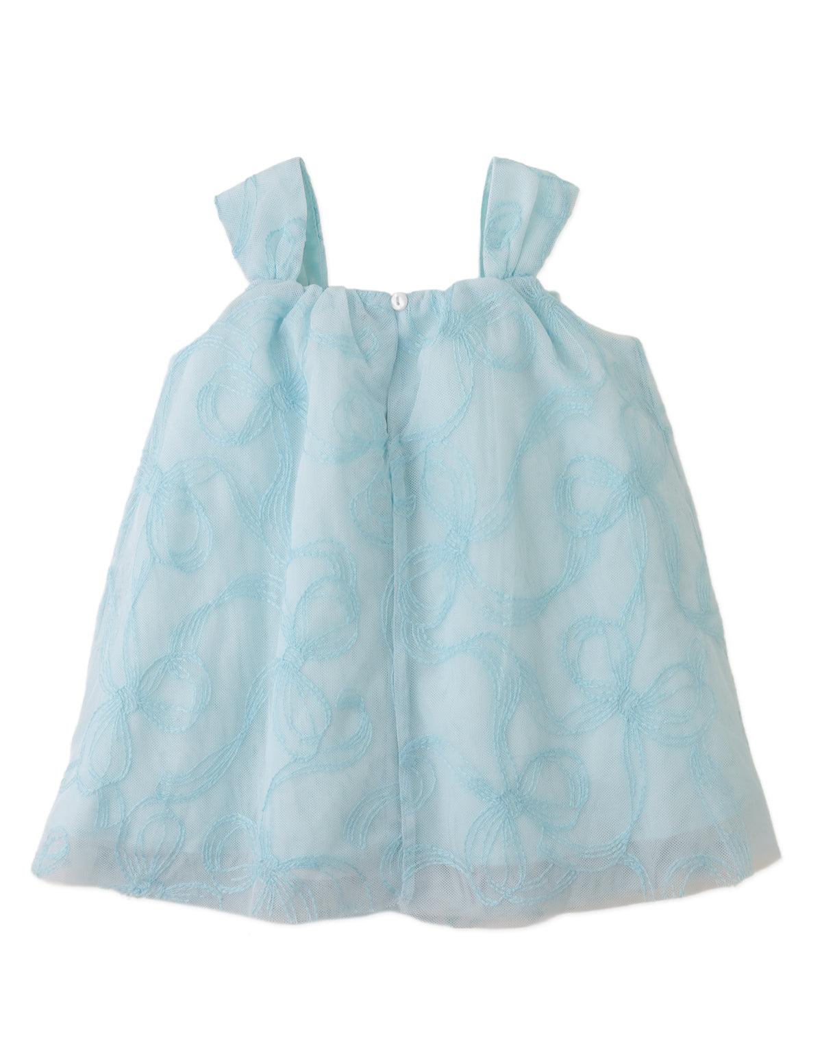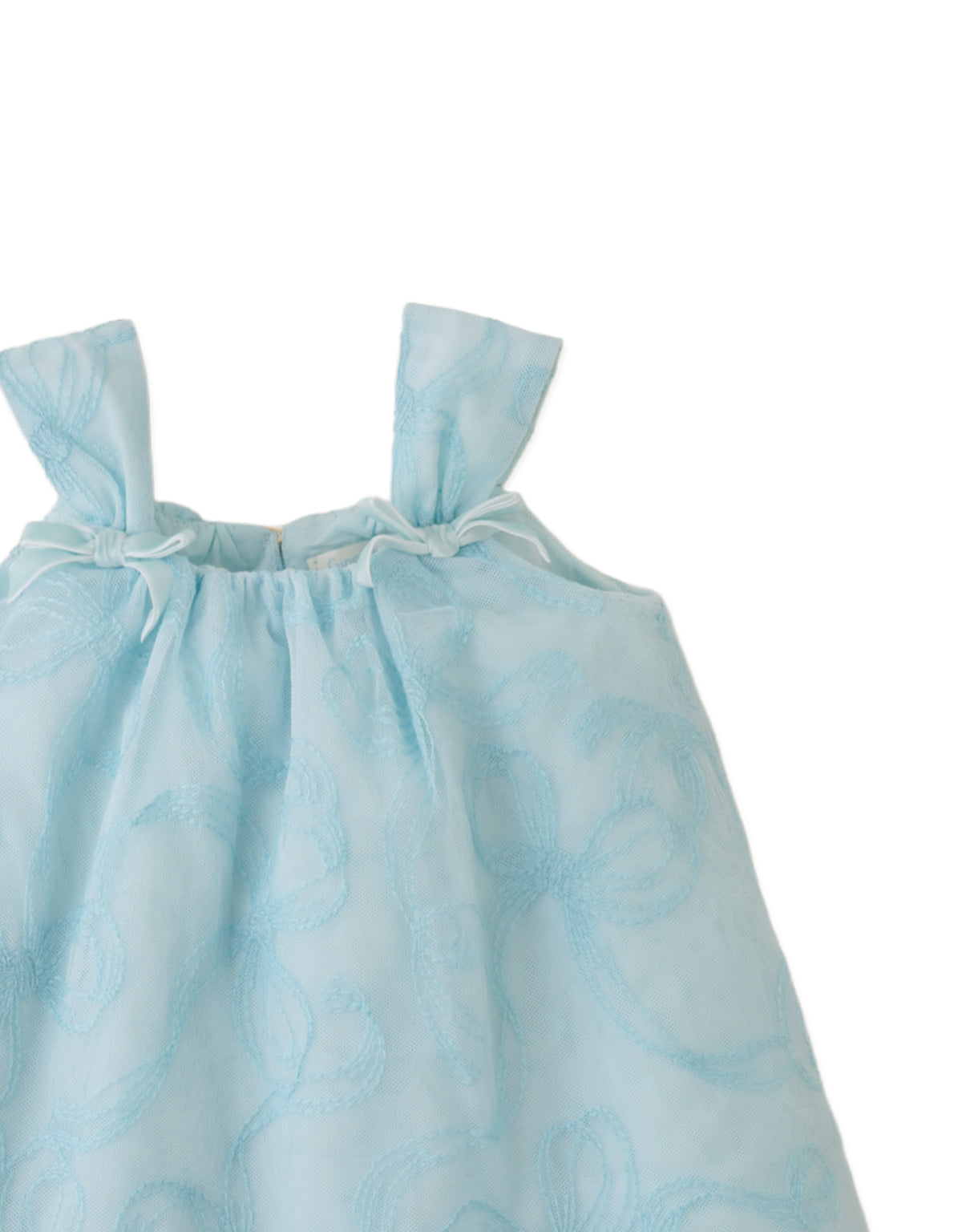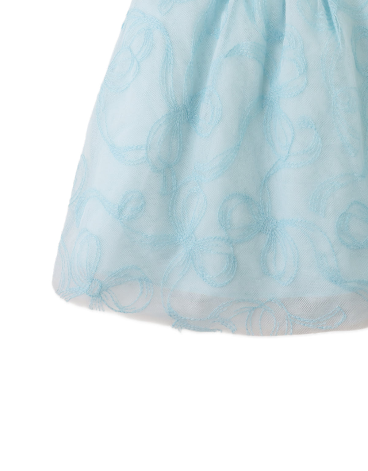 Adorn her in elegance with the tulle dress with embroidered bows and velvet strap ties — a pastel-blue dream that captures grace, whimsy, and every unforgettable moment.
