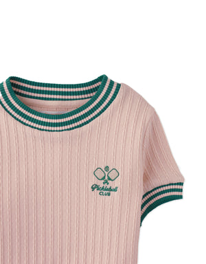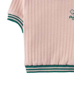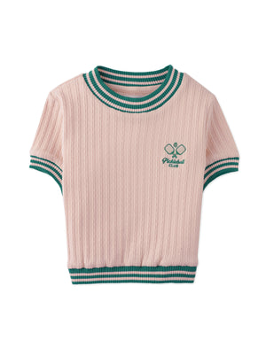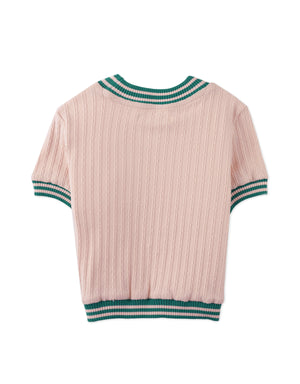 Made from textured jersey, this pink knit top stands out with its bold striped neck, cuffs, and hem