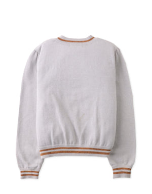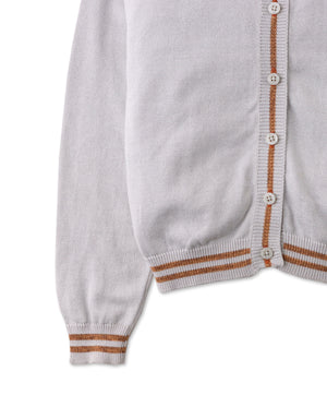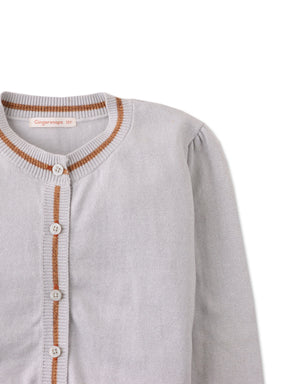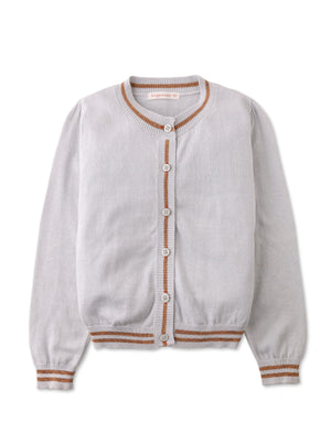 Keep cozy and cute in this silver knit cardigan, designed with playful striped trims!