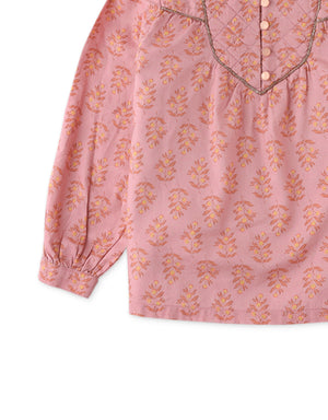 GIRLS FLORAL PRINT TOP WITH WADDED YOKE AND LUREX INSERT CORD