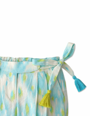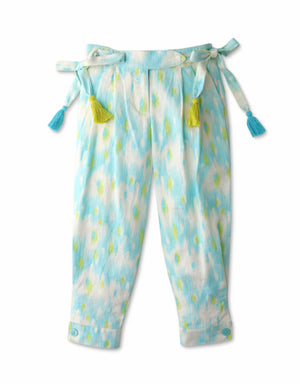 GIRLS IKAT PRINT PANTS WITH TIES & TASSEL FRINGE