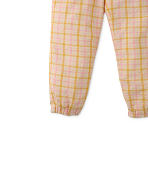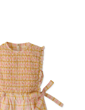 Comfort meets style with our cable-smocking bodice jumpsuit adorned with playful side ties and a happy checkered print!