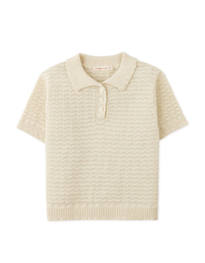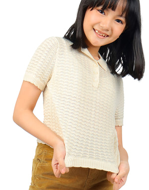 Dress in comfort and style with this knitted collared top in a delicate off-white shade, complete with scallop trims for added fun!