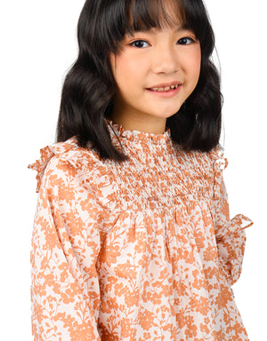 GIRLS PRINTED LONG SLEEVES TOP WITH DIAMOND SMOCKED YOKE