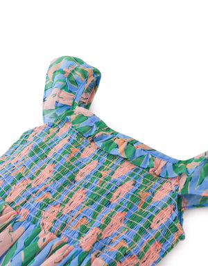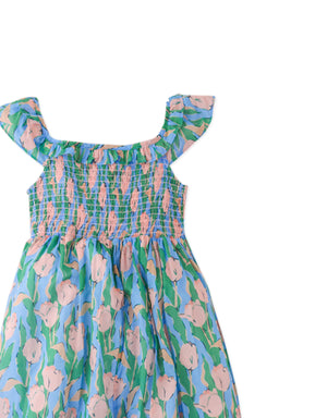 Twirl in grace with this floral print maxi dress for girls, crafted from lightweight cotton chiffon, features a smocked bodice and delicate ruffle accents for a breezy, multicolor statement look.
