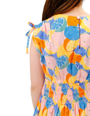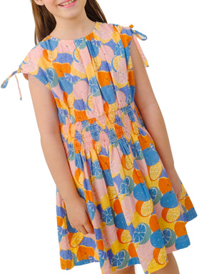 GIRLS RUCHED SHOULDERS CITRUS PRINT DRESS