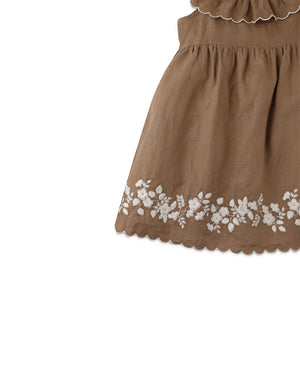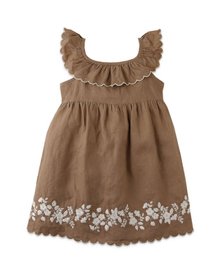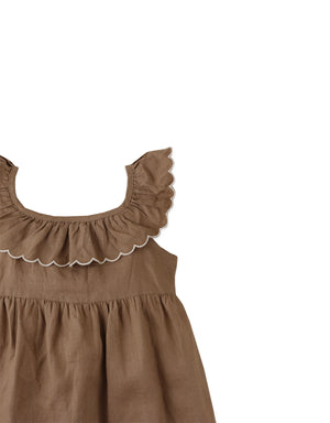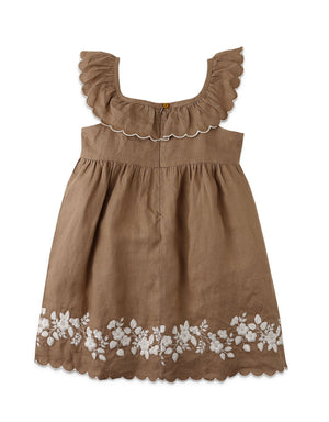 Look adorable in this baby doll linen dress, embellished with fancy scallop trims and an embroidered hem!