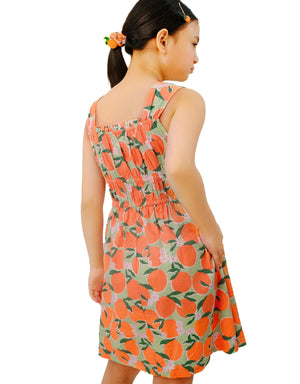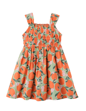 GIRLS SHIRRED ORANGE PRINT DRESS