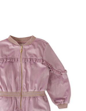 This stunningly luxurious velour zip-up tracksuit in a plush purple hue is adorned with playful ruffles for a fun take on a sporty look.