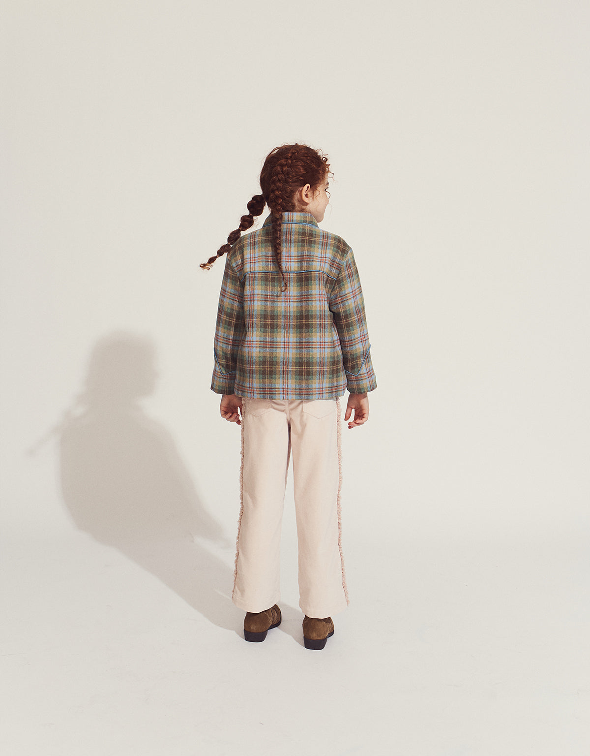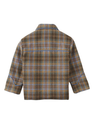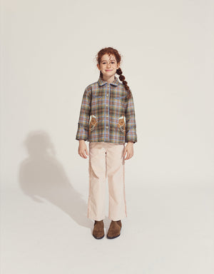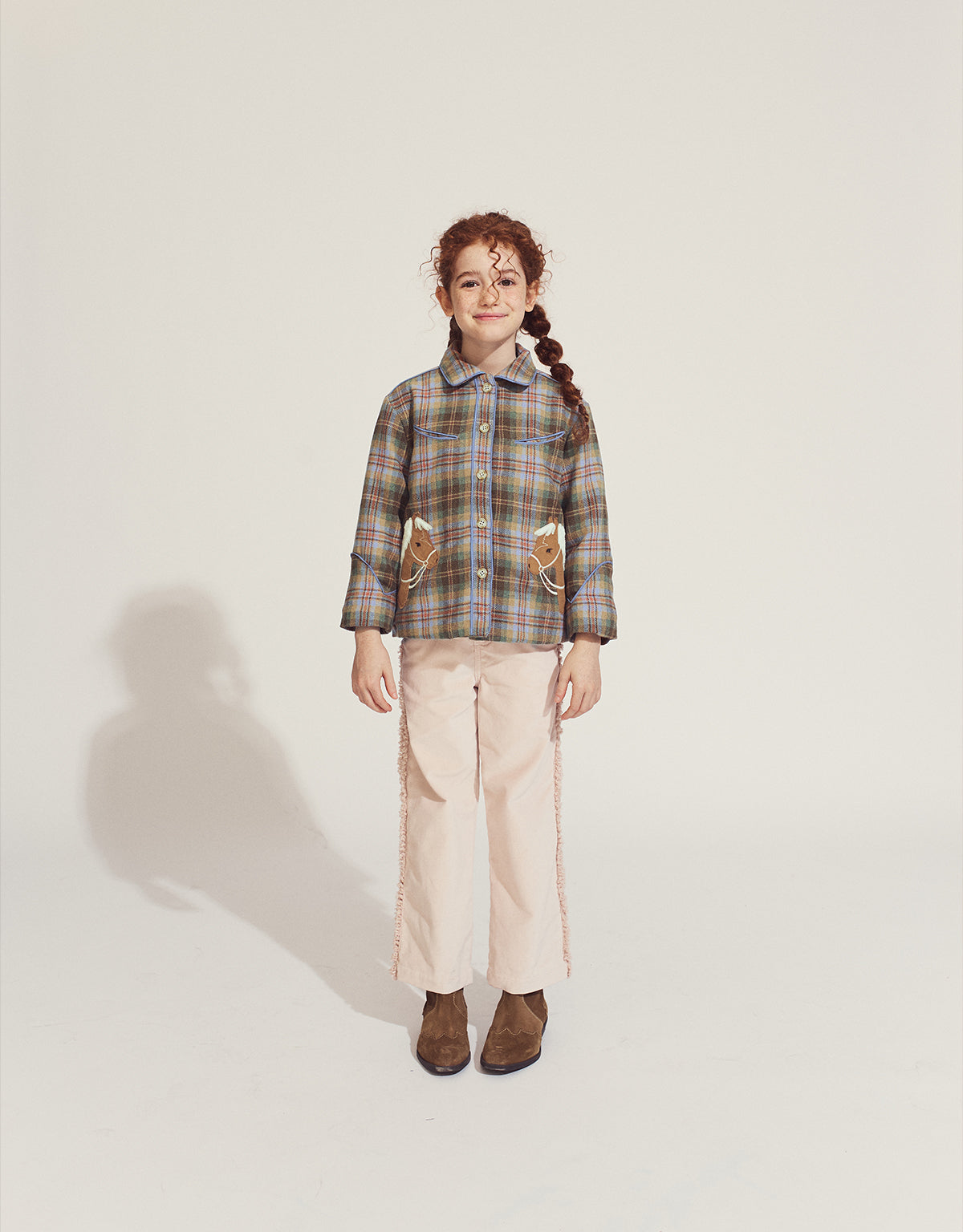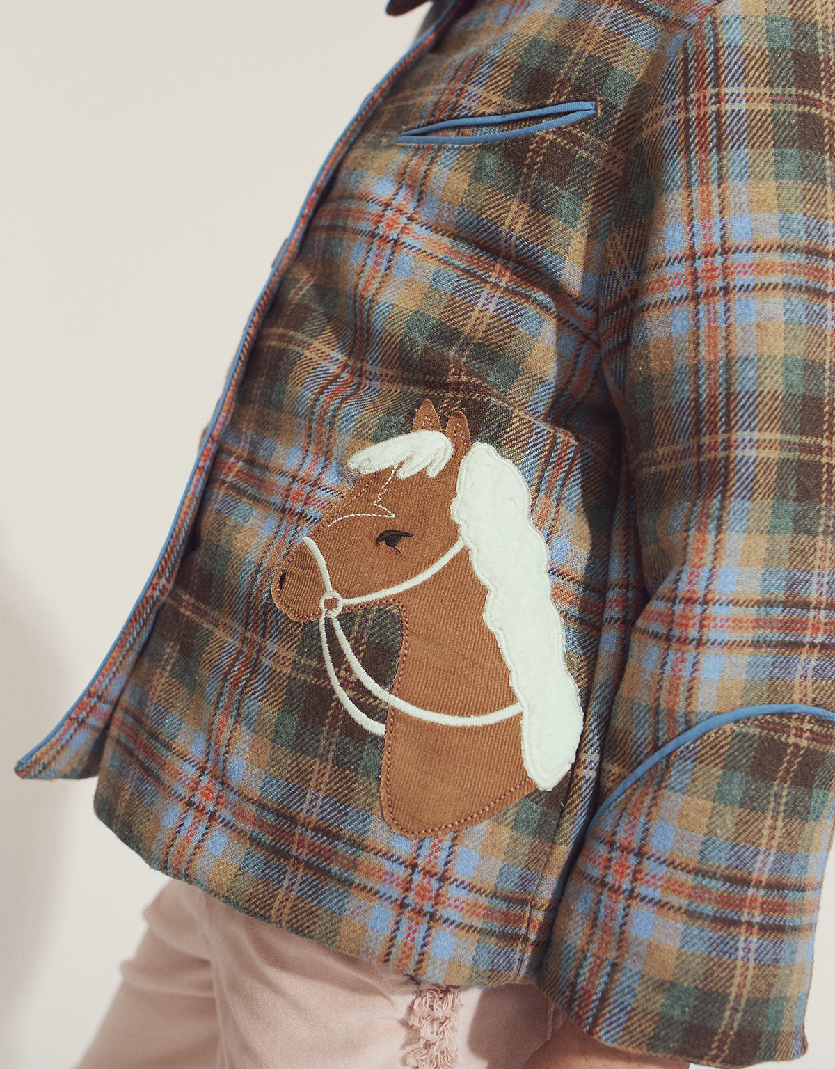 The Isadora Shirt Jacket in Wyeth plaid, with its contrast inserts and playful horse appliqués, blends country charm with modern flair for a stylish, versatile piece perfect for any occasion.