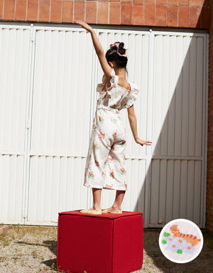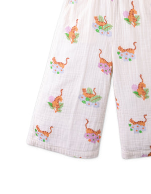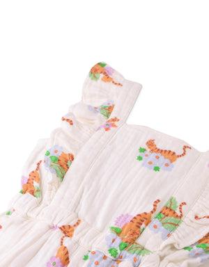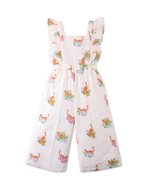 Roar with style in our Ivana jumpsuit in tiger print, complete with ruffle sleeves, perfect for your explorer's wild adventures.