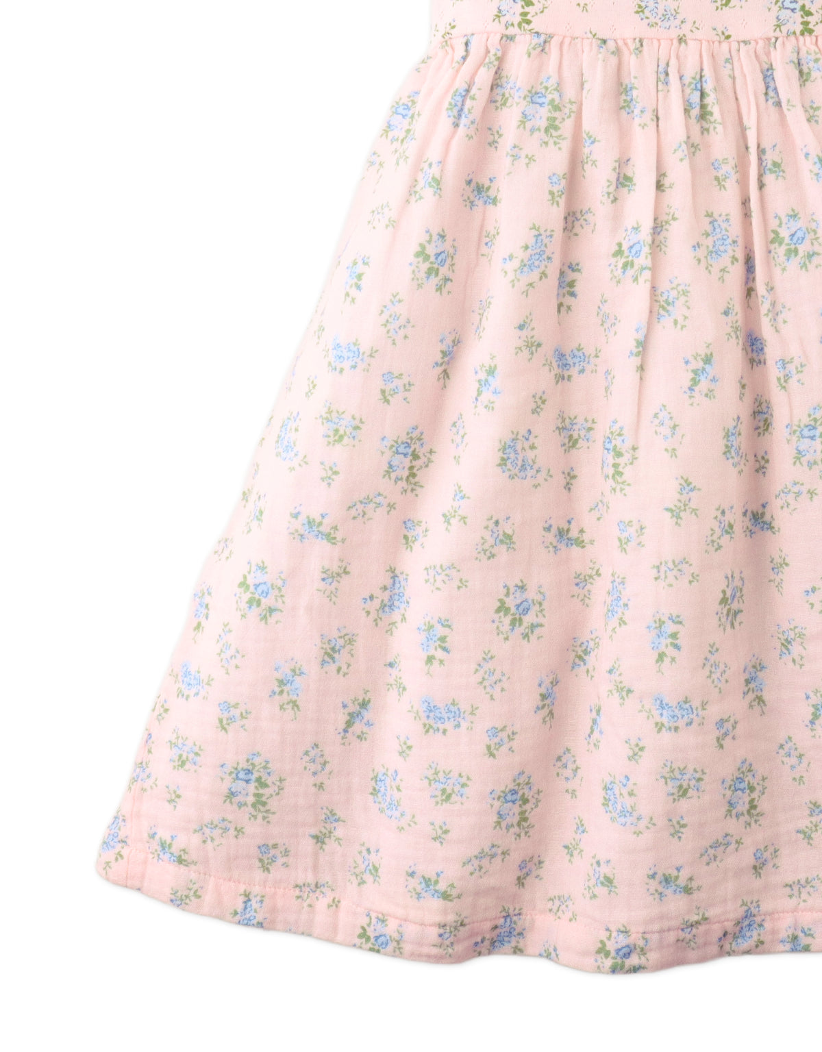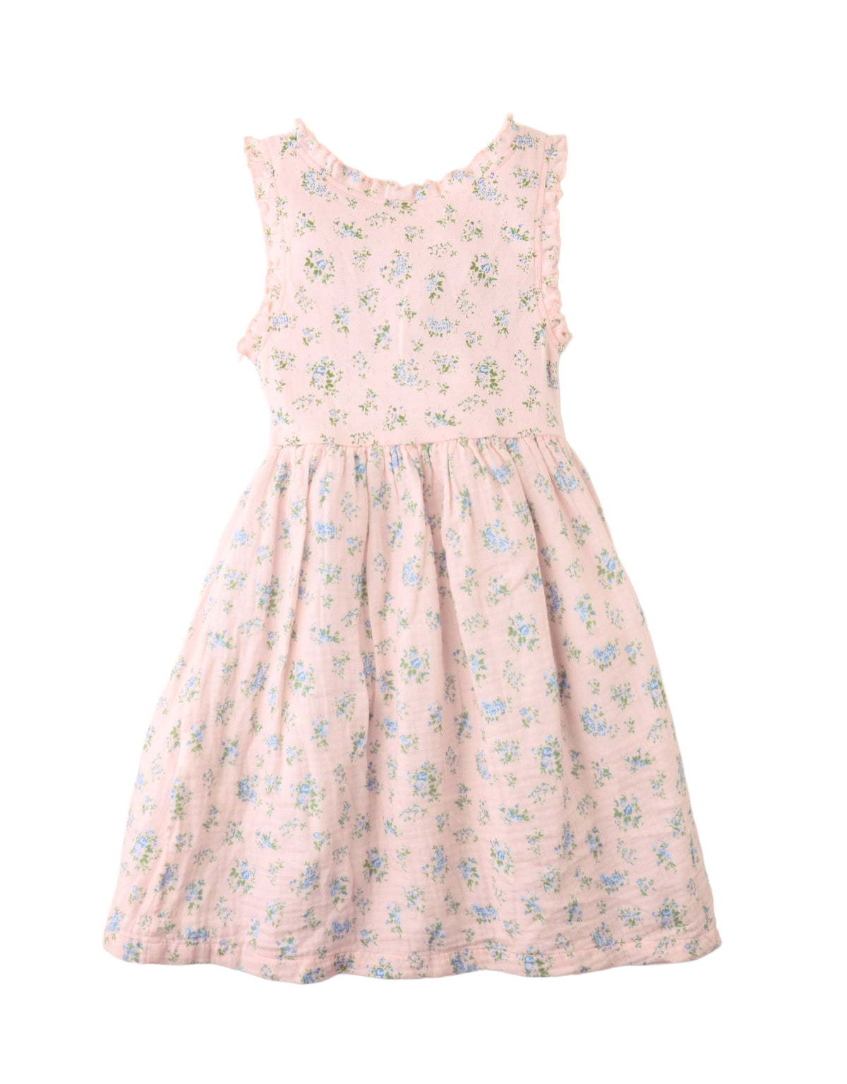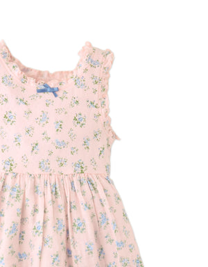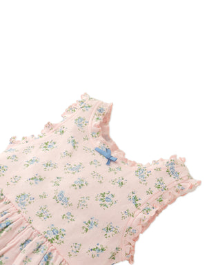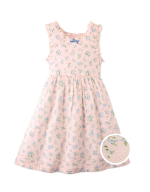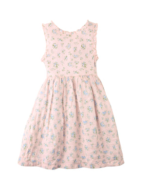 Dress your little one in this purple floral ditsy dress, with a ruffle-trimmed top and flowing muslin bottom for twirls, play, and warm adventures.