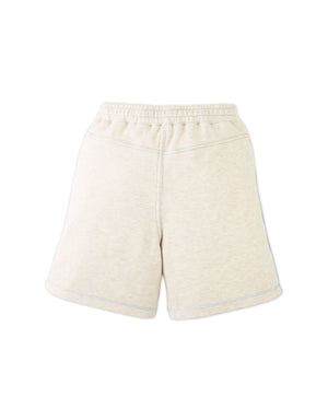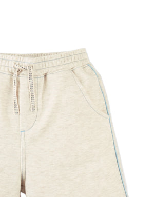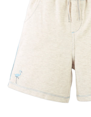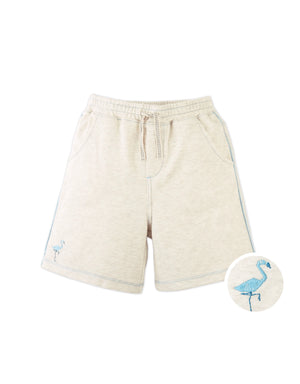 These beige pull-on terry shorts are anything but basic: melange texture, contrast piping, and a subtle embroidered design combine for a cool, active look that’s made for play and lounging alike.