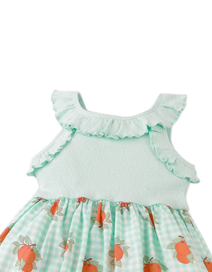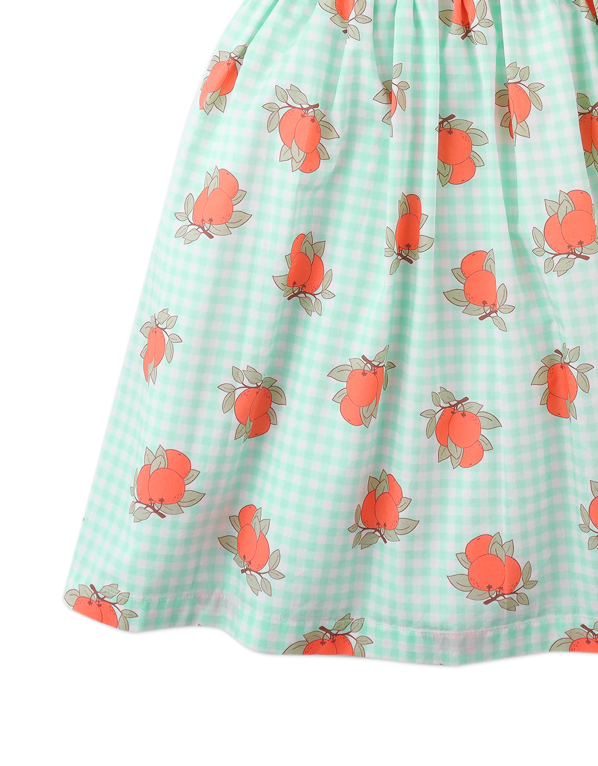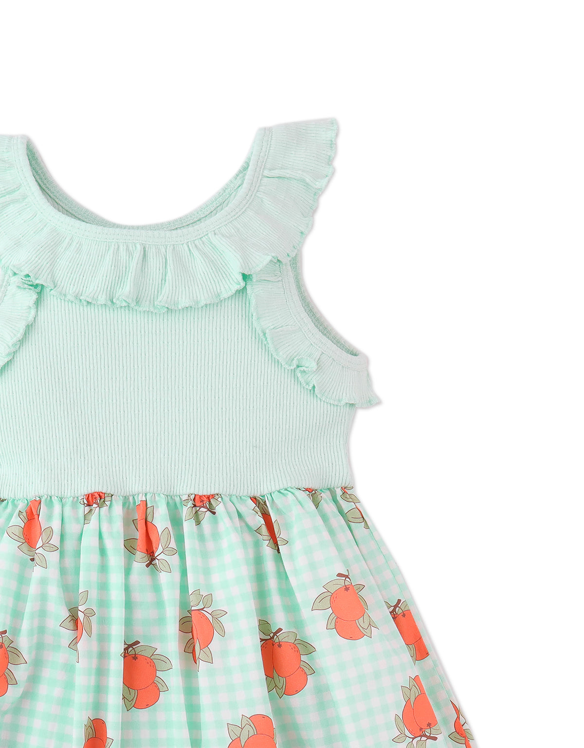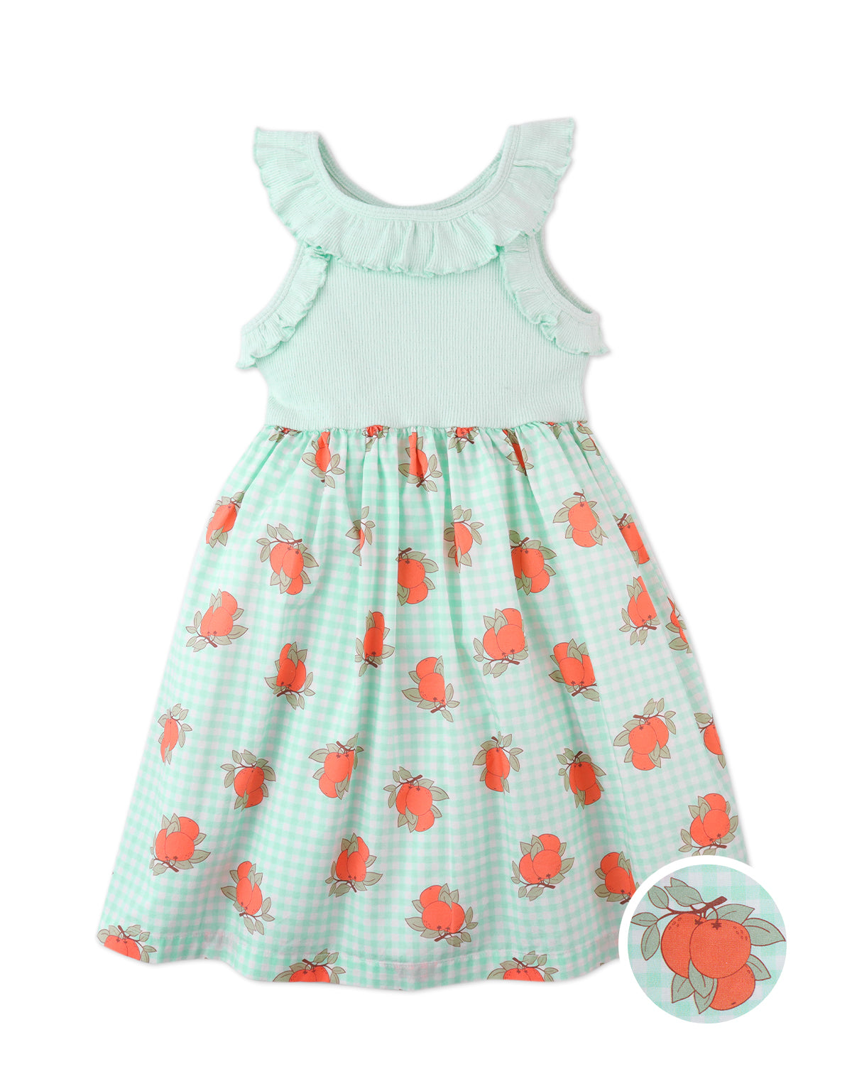 This green frilled pointelle bodice dress with an orange gingham print bottom blends playful patterns and delicate details, perfect for playtime.