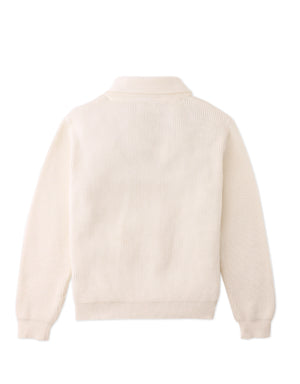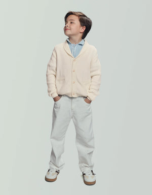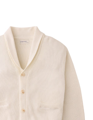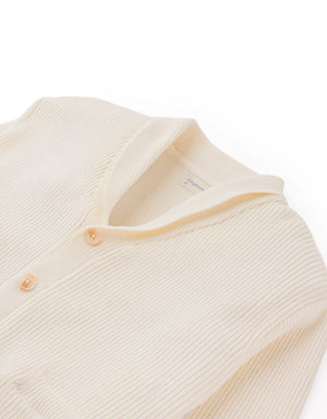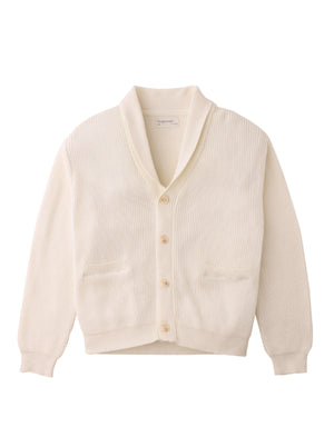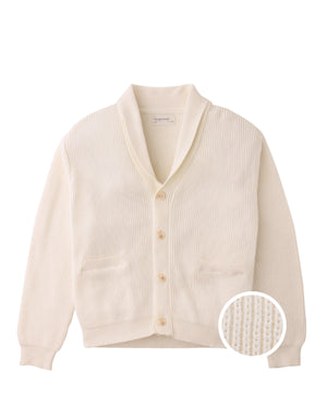 Whether for layering on breezy days or dressing up casual looks, this combed cotton scarf collar cardigan in off-white offers both comfort and style.