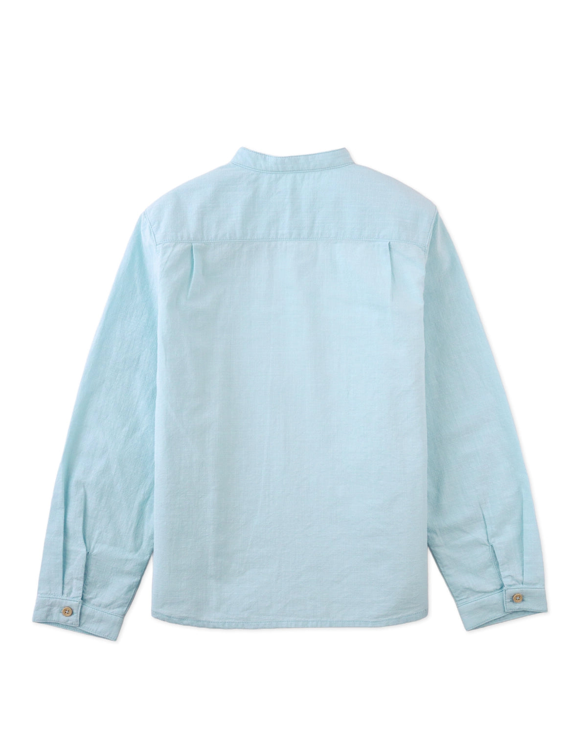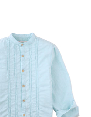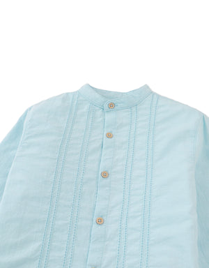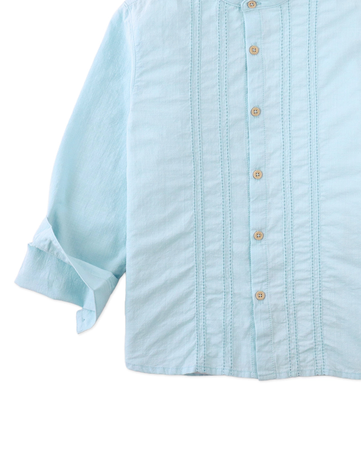 Tailored for little trailblazers, this long-sleeved oriental shirt in breathable, linen-like cotton keeps them comfortable while offering just the right hint of sophistication. The intricate geometric lace trims add texture and flair, perfect for family occasions.