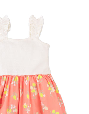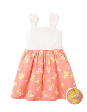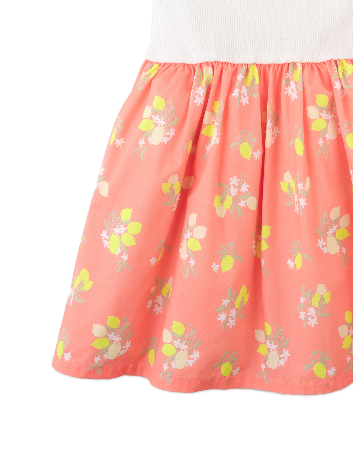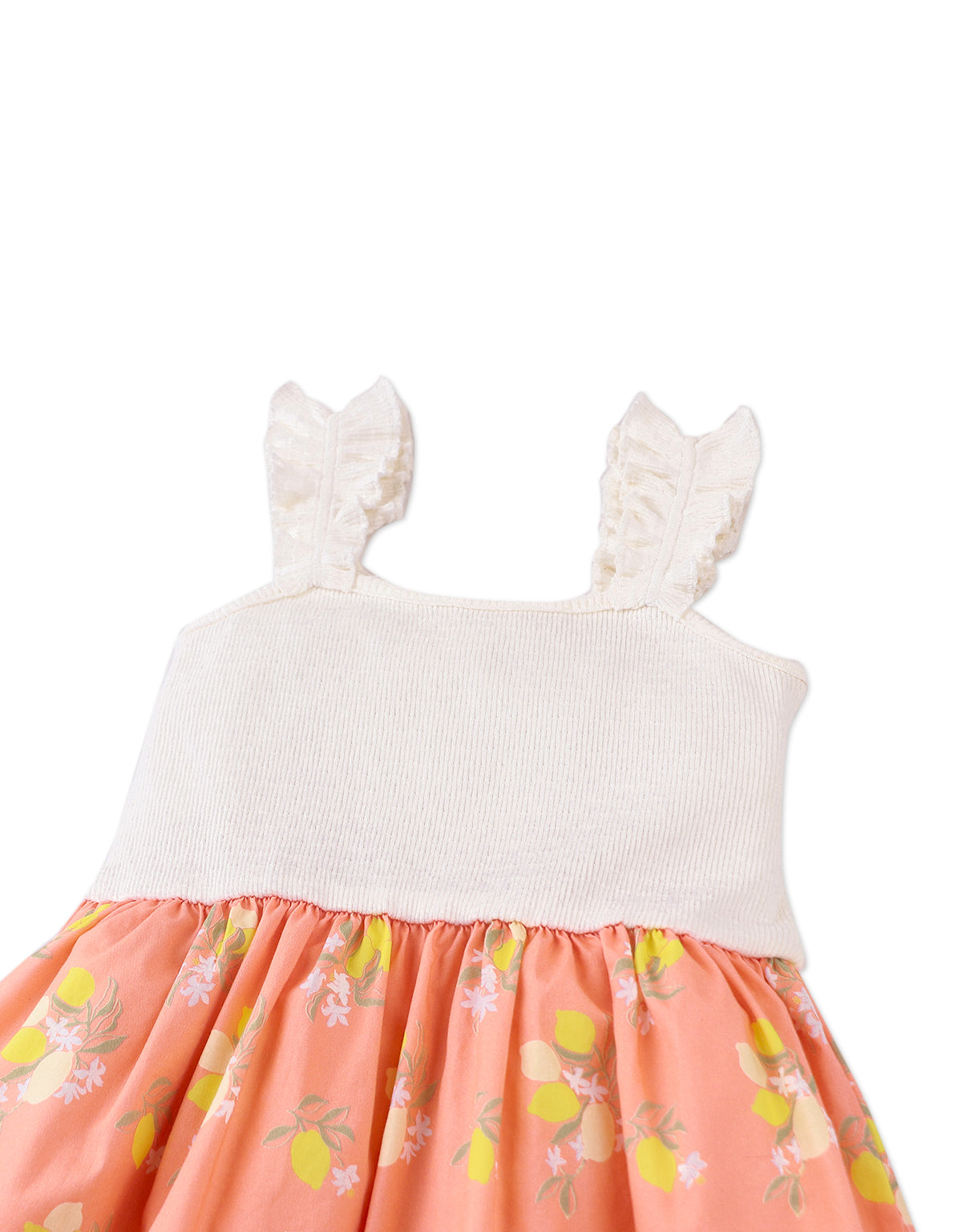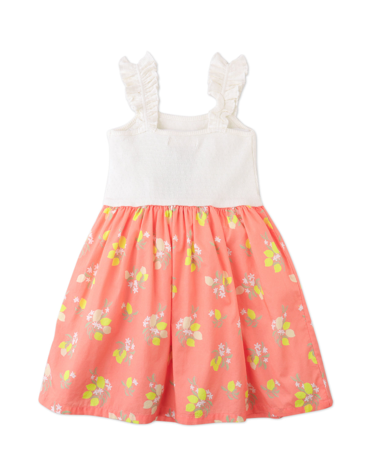 This dress with a ribbed top, ruffle strap sleeves, and shirred bottom is a fresh pick for any occasion. Its zesty lemon print adds a burst of fun to your little one's wardrobe.