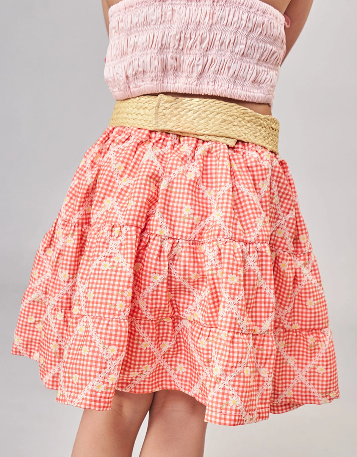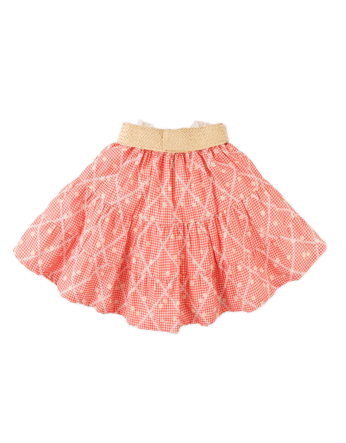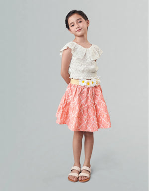 Tiered layers with a cheerful peach print and diamond pattern embroidery make this skirt a standout. Finished with a raffia belt and a sweet corsage of flowers, full of playful charm.