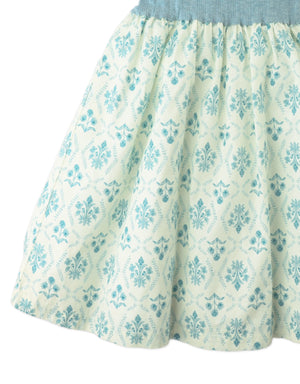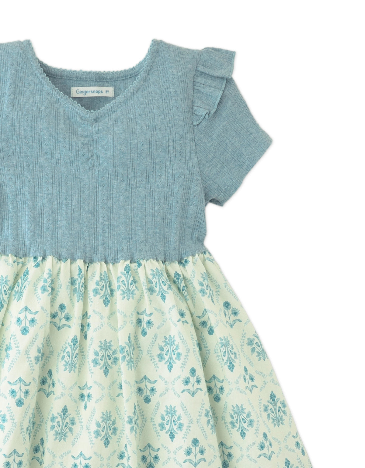 JULIANA DRESS WITH DENIM POINTELLE BODICE AND PRINTED WOVEN SKIRT