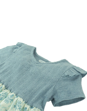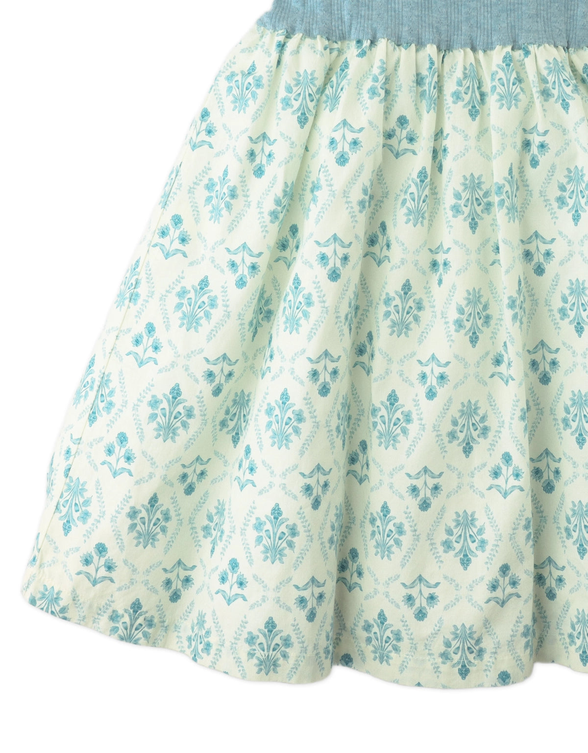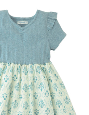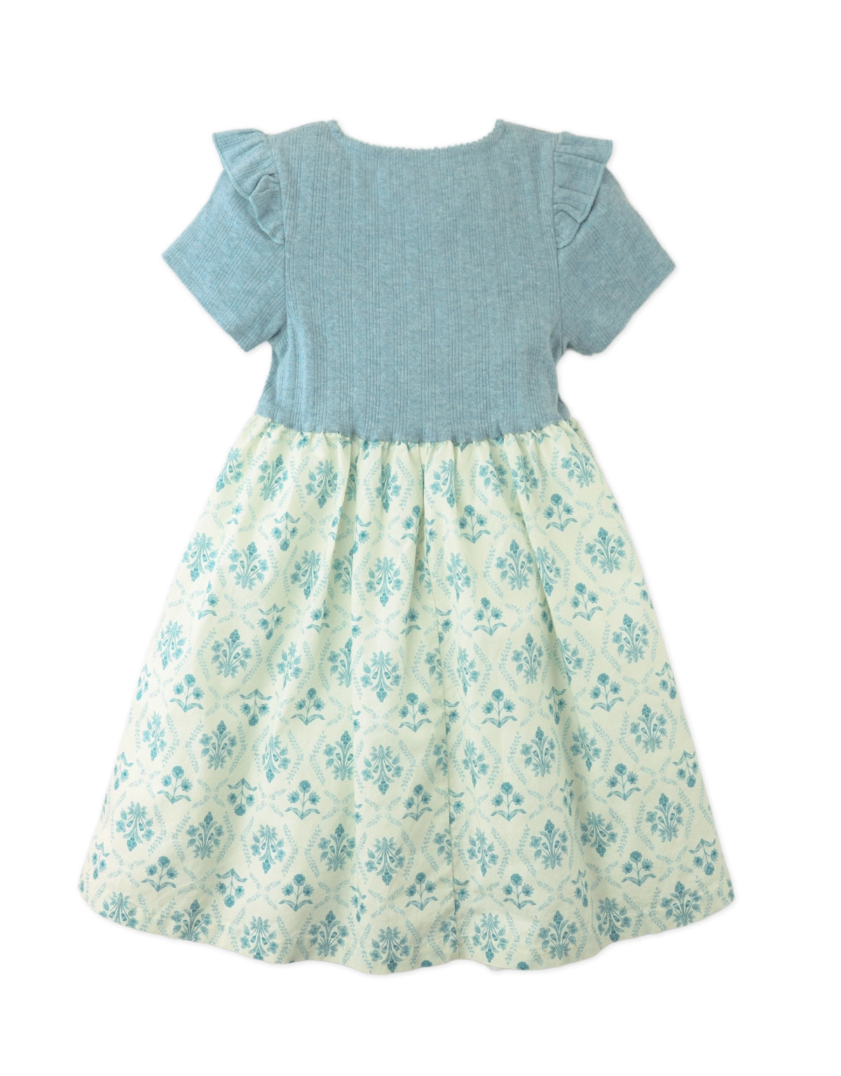 This dress combines a denim pointelle mélange bodice with a tile-print woven skirt, offering stretch, comfort, and freedom of movement for your little girl.