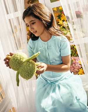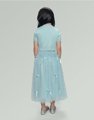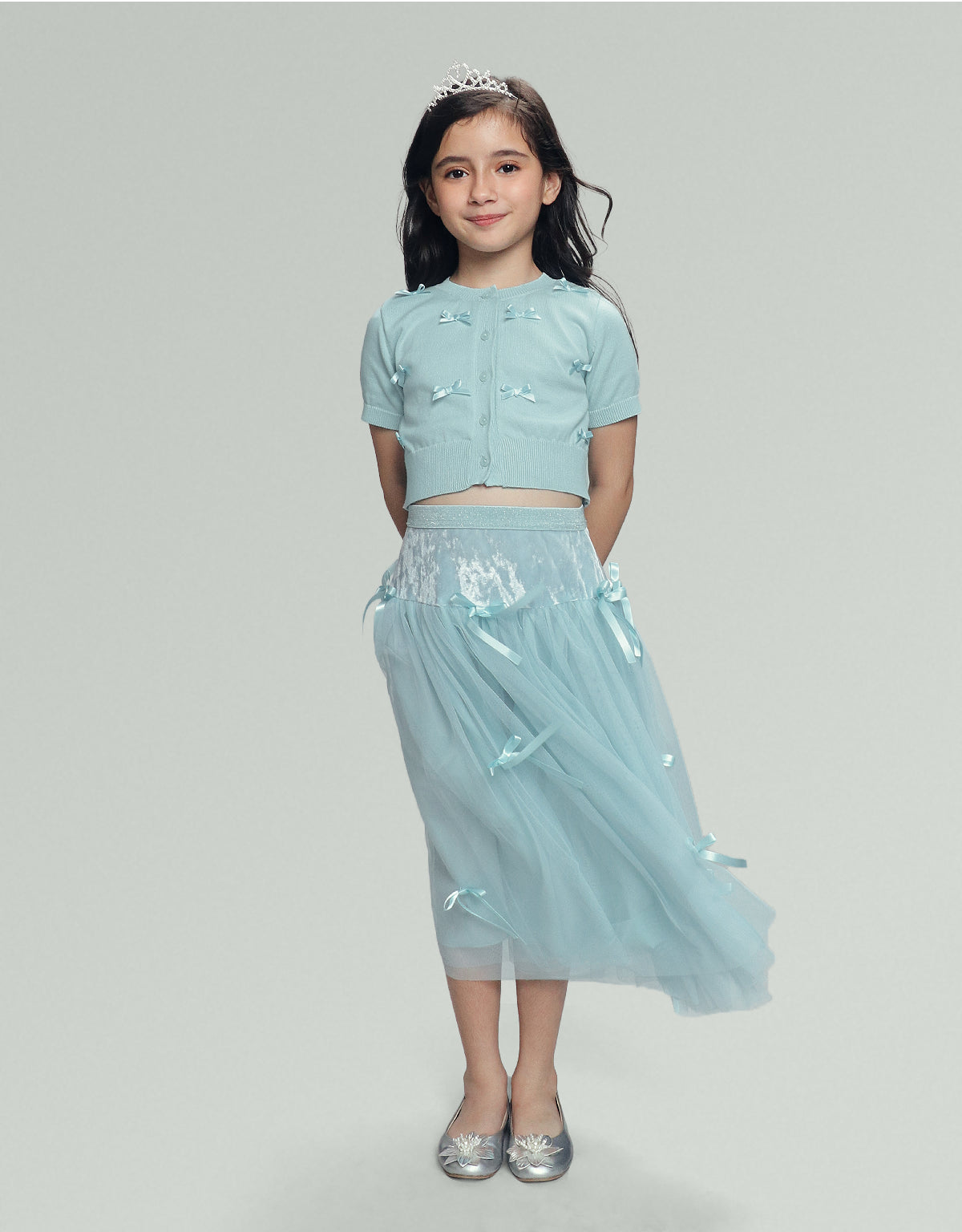 This knitted short-sleeve cardigan is adorned with dainty bow details, adding playful grace to its classic silhouette. Perfect for both dressy and casual days, especially when paired with our Madison Maxi Skirt.
