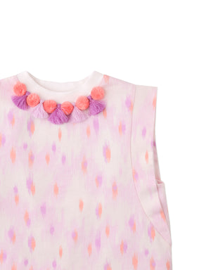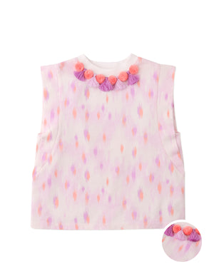 Add a playful pop to her ensemble with our Katya printed top adorned with handmade pompoms and tassels, ensuring every outfit is a celebration of fun.