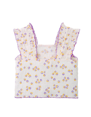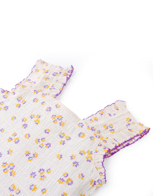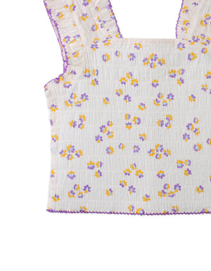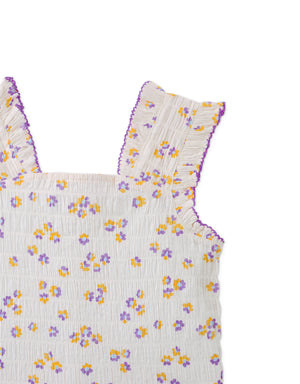 Jump with joy in our Laura sleeveless smocked tank top, where ruffles dance like laughter in the breeze, perfect for your little ray of sunshine.