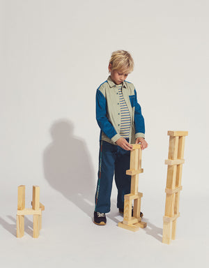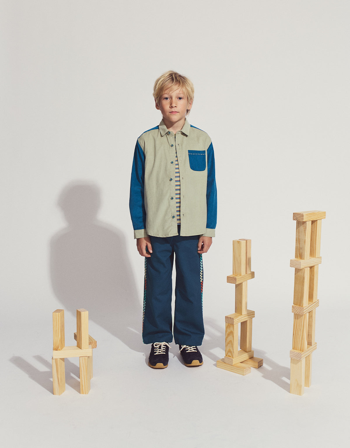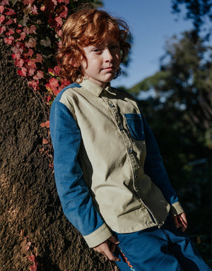 LIEV BUTTON DOWN LONG SLEEVES SHIRT PALE OLIVE/BLUE COLORBOCK WITH MACHINE STITCHING ACCENTS