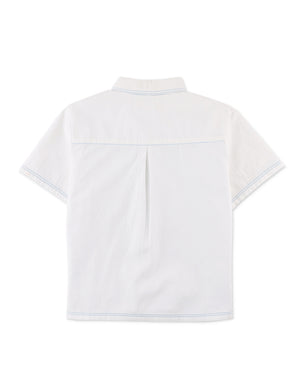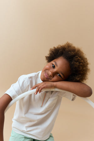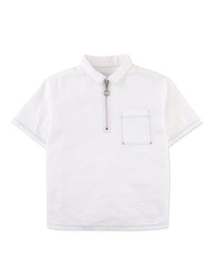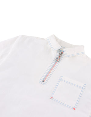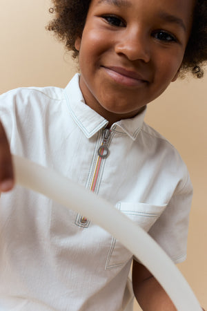 Upgrade your boy's wardrobe with our stylish Lorenzo shirt with contrast-stitched and quarter zip woven in coconut milk hue, crafted from durable twill for both comfort and lasting quality.