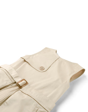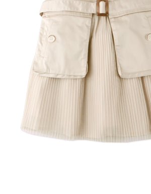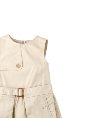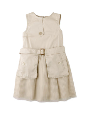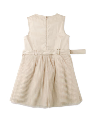 This charming sleeveless dress features a pleated tulle skirt, side pockets, and a belt, crafted from a soft cotton-nylon blend in an elegant beige hue, perfect for your little one's wardrobe.