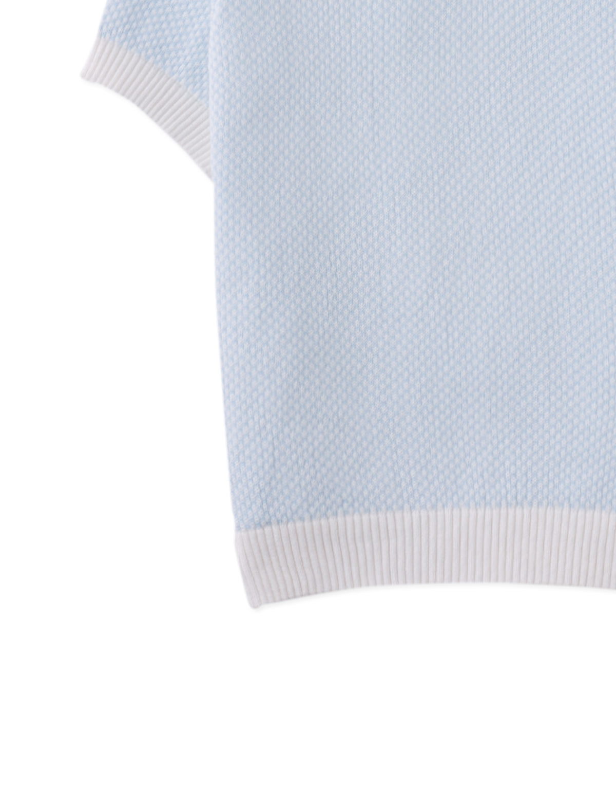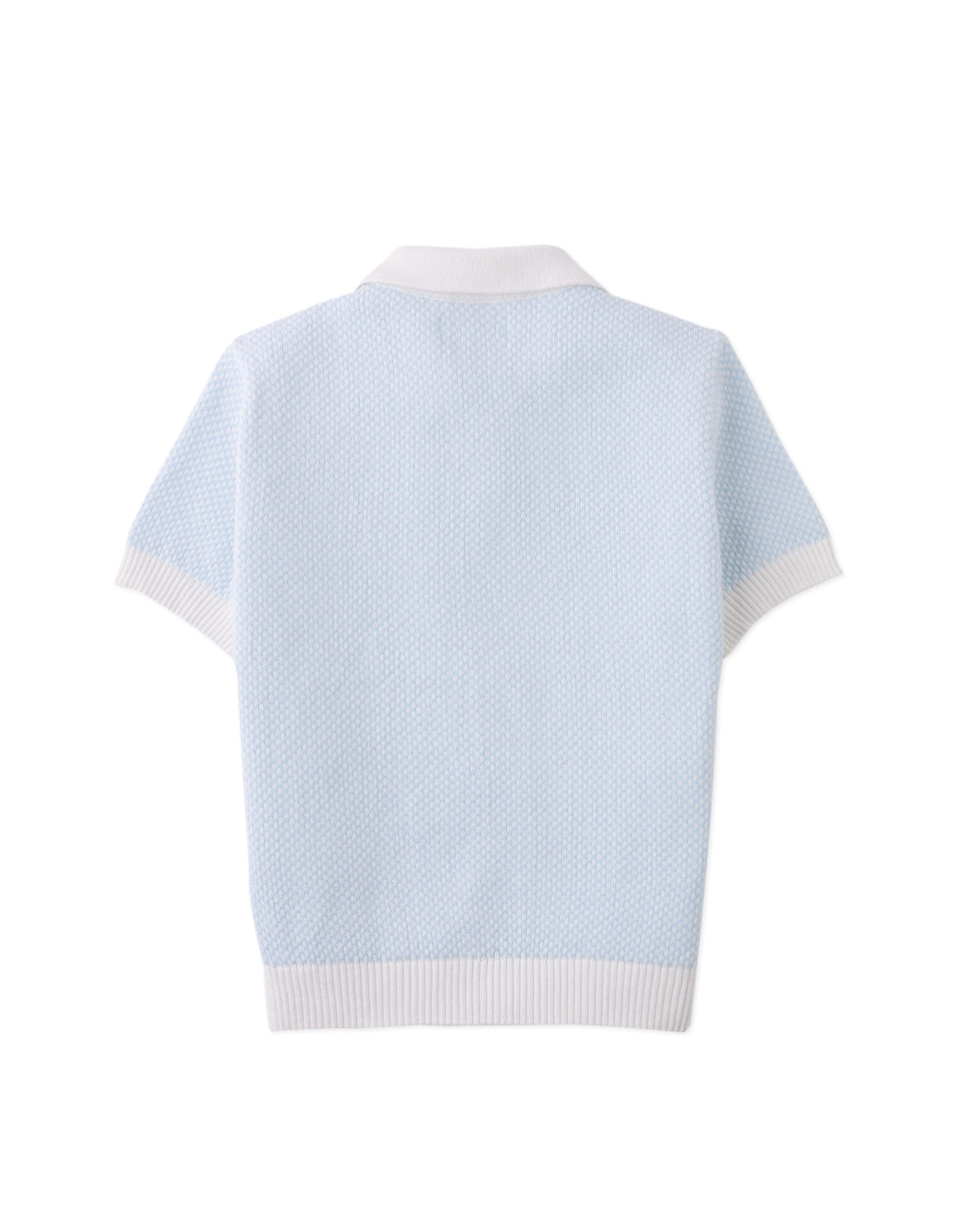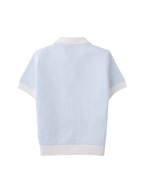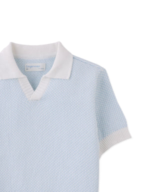 Dress your little one in this stylish 2-tone starlight blue and brilliant white jacquard knit short sleeve polo, featuring an open placket and ribbed details for a casual yet sharp appearance.