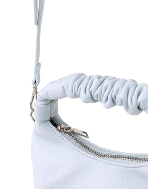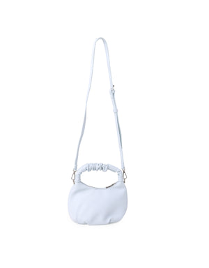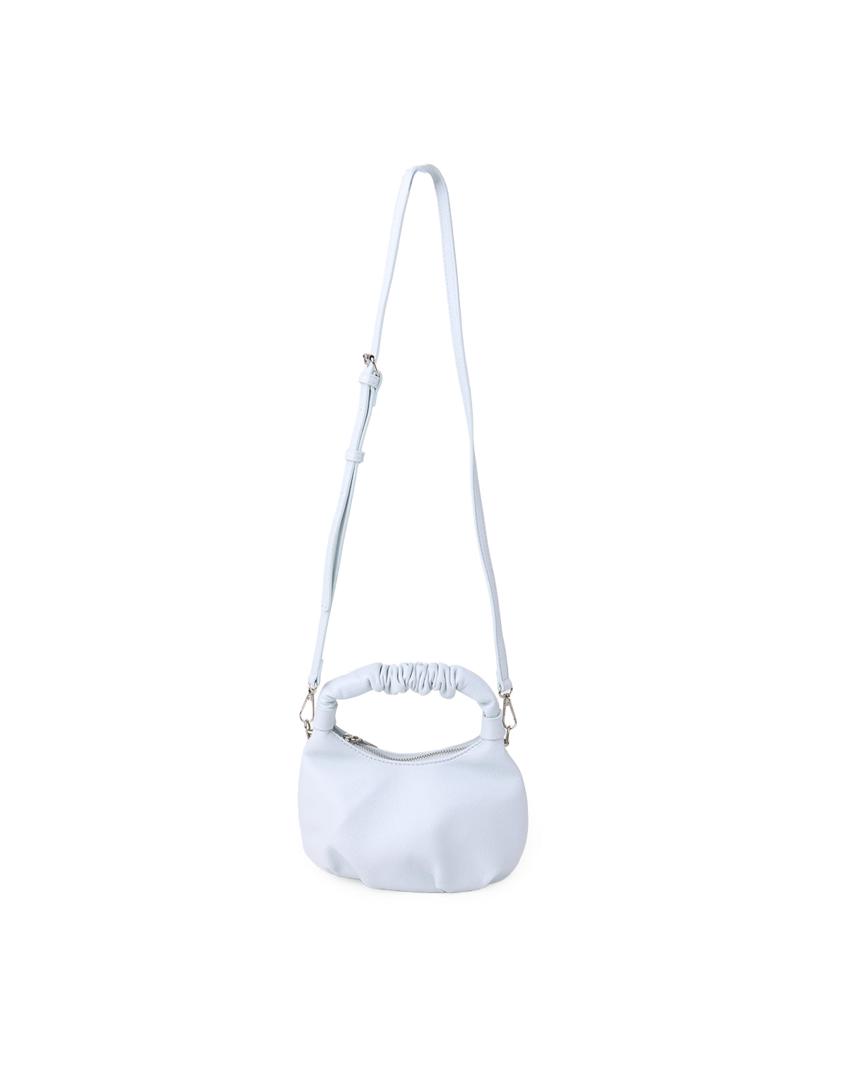 Available in light pink and light blue, this faux leather mini handbag with a ruched handle is perfect for carrying little essentials.
