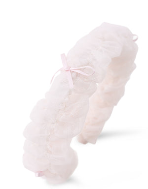 A dainty pink headband topped with ruched tulle and adorable little bows.