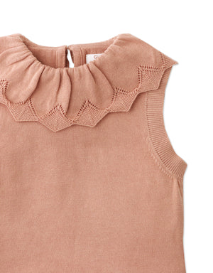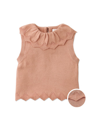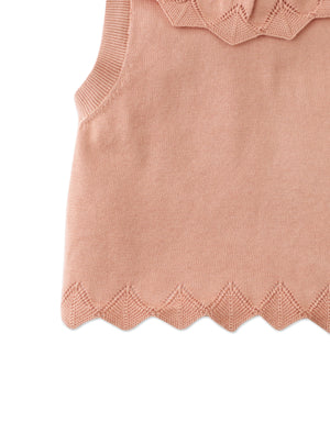 This knitted vest features a scalloped pointelle neck and hem for a delicate, textured finish, keeping your little doll cozy and stylish.