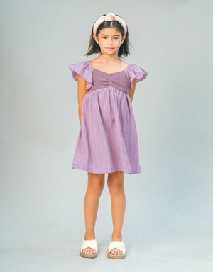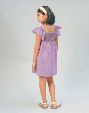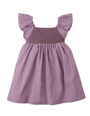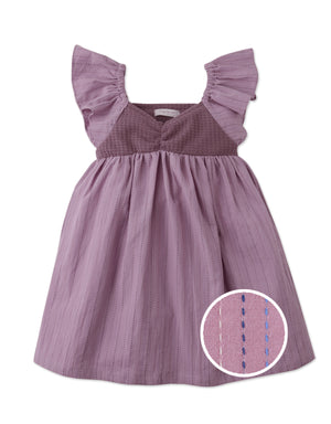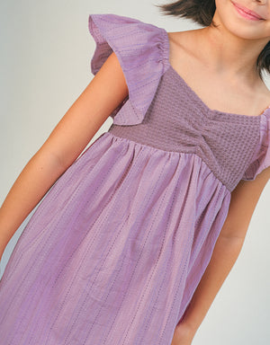 Radiating effortless charm, this lilac dress pairs a knitted sweetheart bodice with playful ruffle sleeves for a look as lovely as your little one.