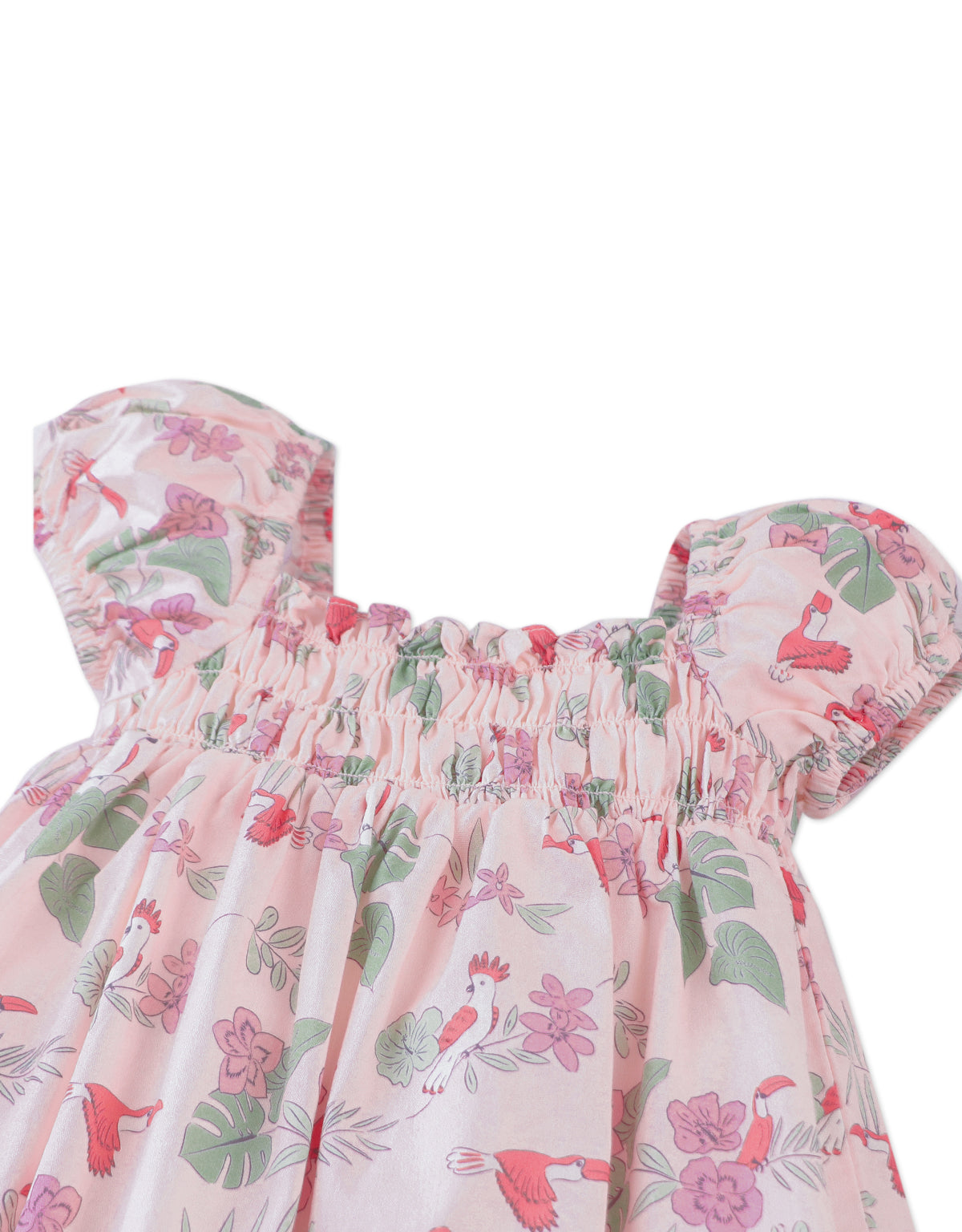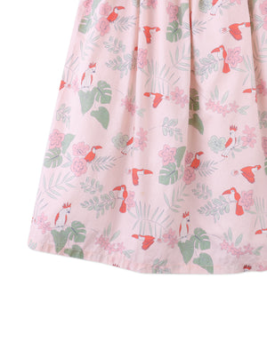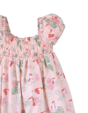 Fit your little princess in this all-over print woven dress with a smocked bodice and puff sleeves, designed in a lively tropical bird print. Perfect for a day of fun and adventure.