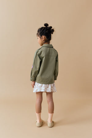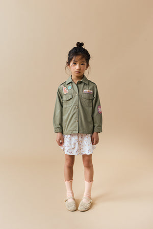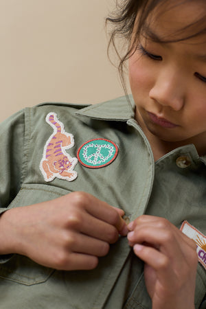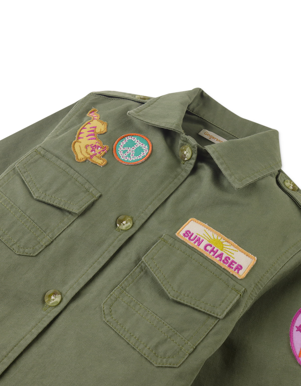 Cool-girl chic meets playful flair with our Riley overshirt jacket, featuring embroidered badges for an effortlessly stylish statement.