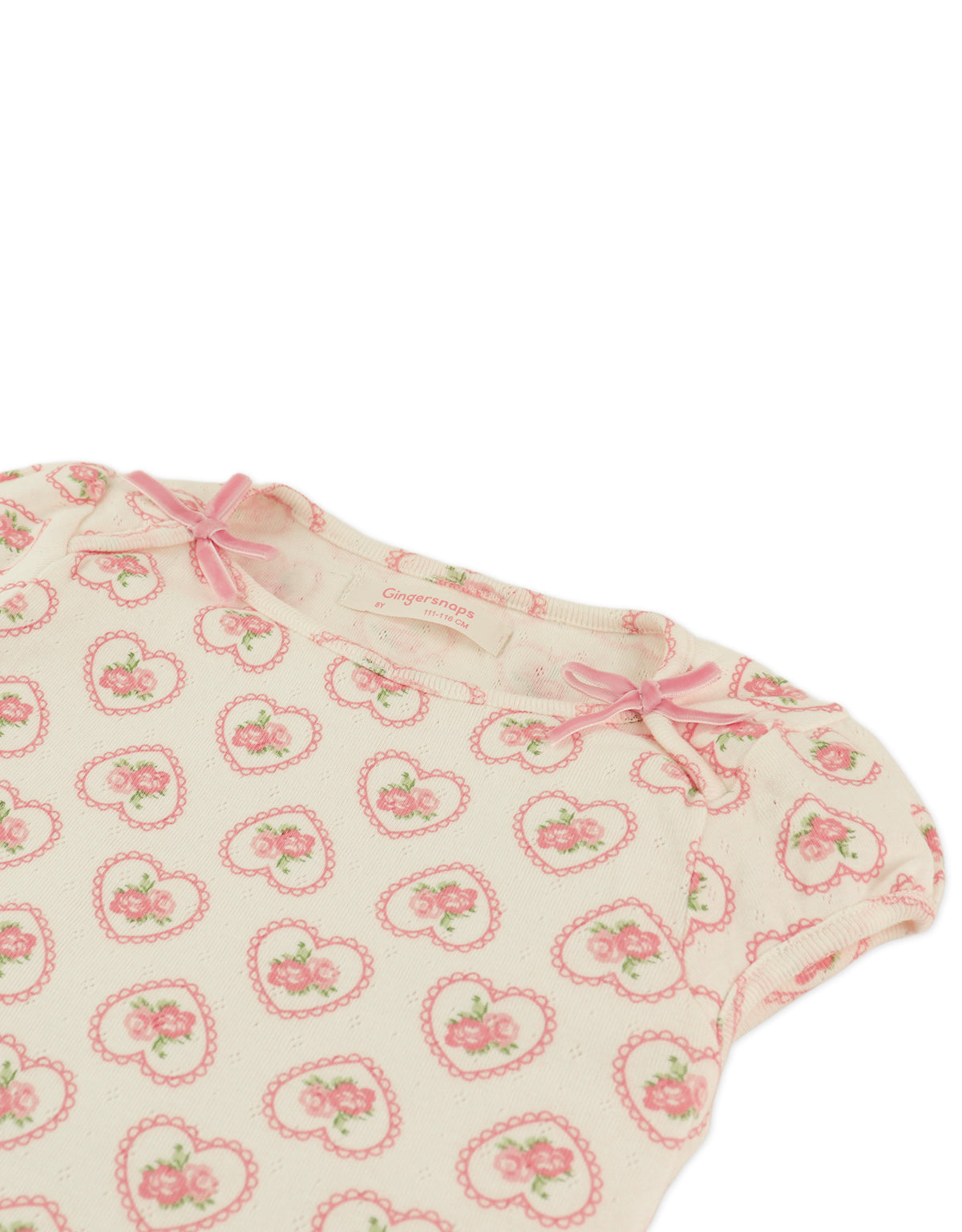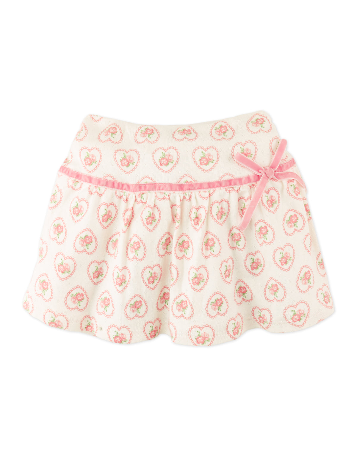 All-over heart prints bring playful pattern to this pointelle jersey skort set, with an envelope collar on the top and a bow-trimmed yoke skirt. It's a great choice for your little girl’s everyday adventures.