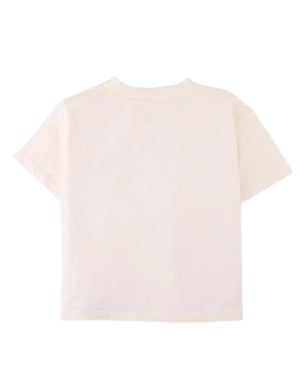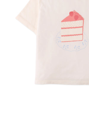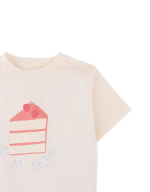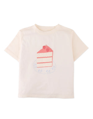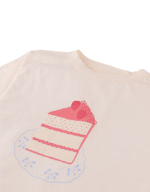 This off-white tee features a playful cake spot print, bringing a delicious pop of joy to casual outfits while staying soft and easy to wear.