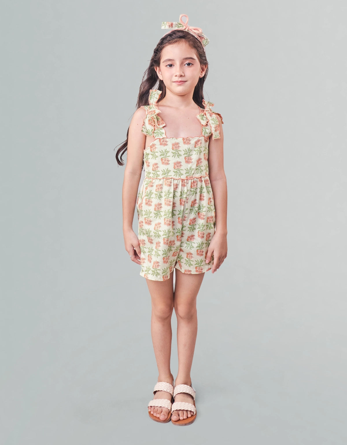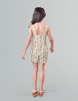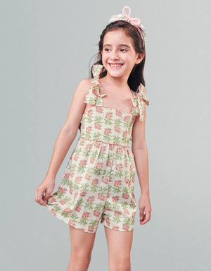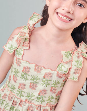 Bright blooms meet breezy design in this floral playsuit, finished with scalloped embroidery that pops along the straps, bodice, and pockets. A standout piece for your little one’s everyday lineup.