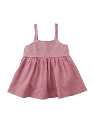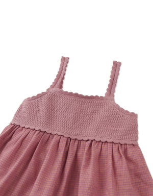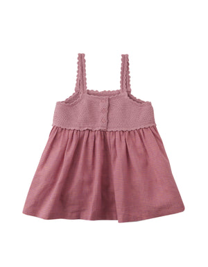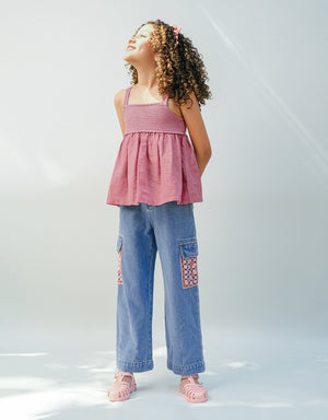 Style your little button in an airy red strappy top with an intricate crochet bodice, perfect for warm days and breezy adventures.