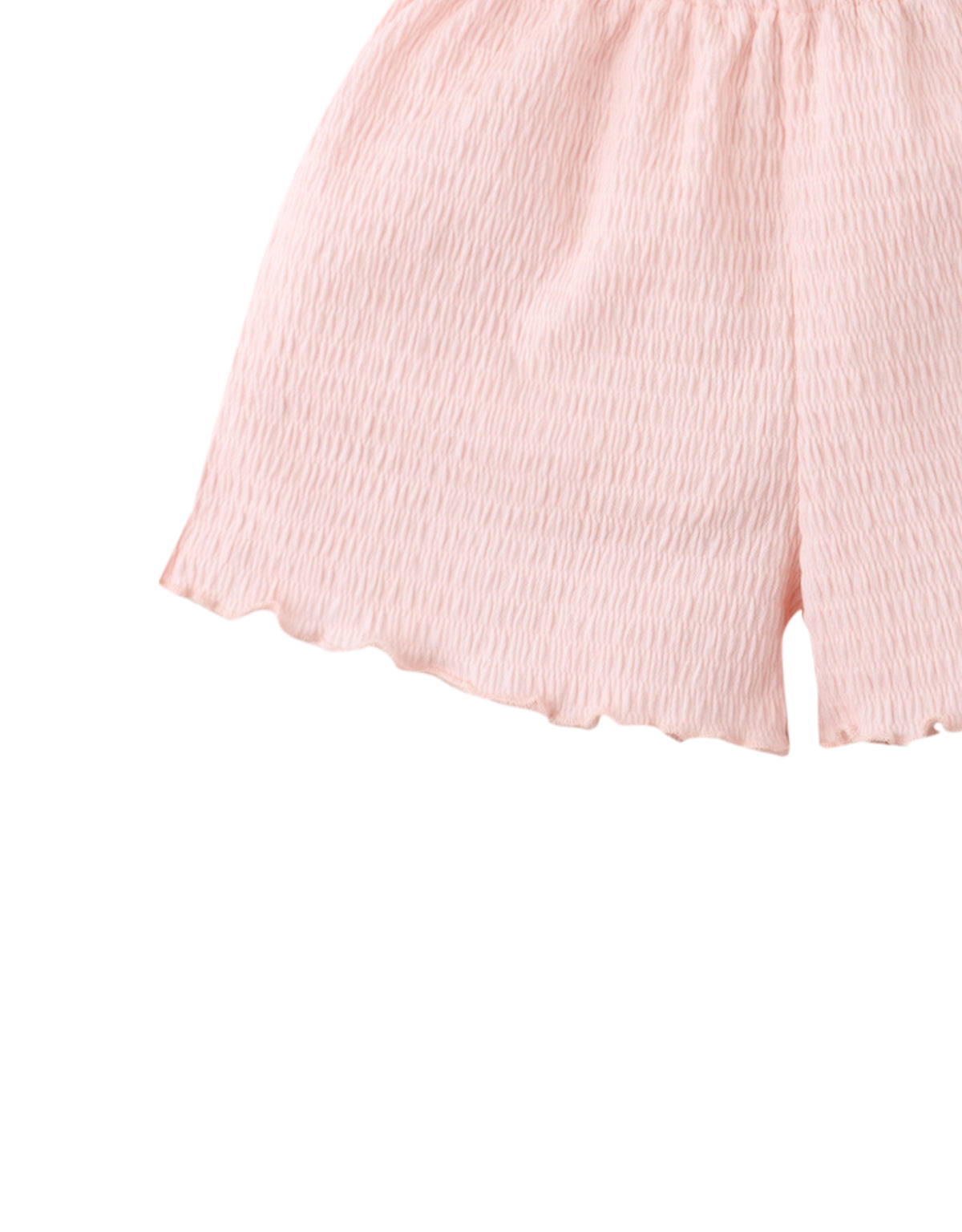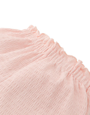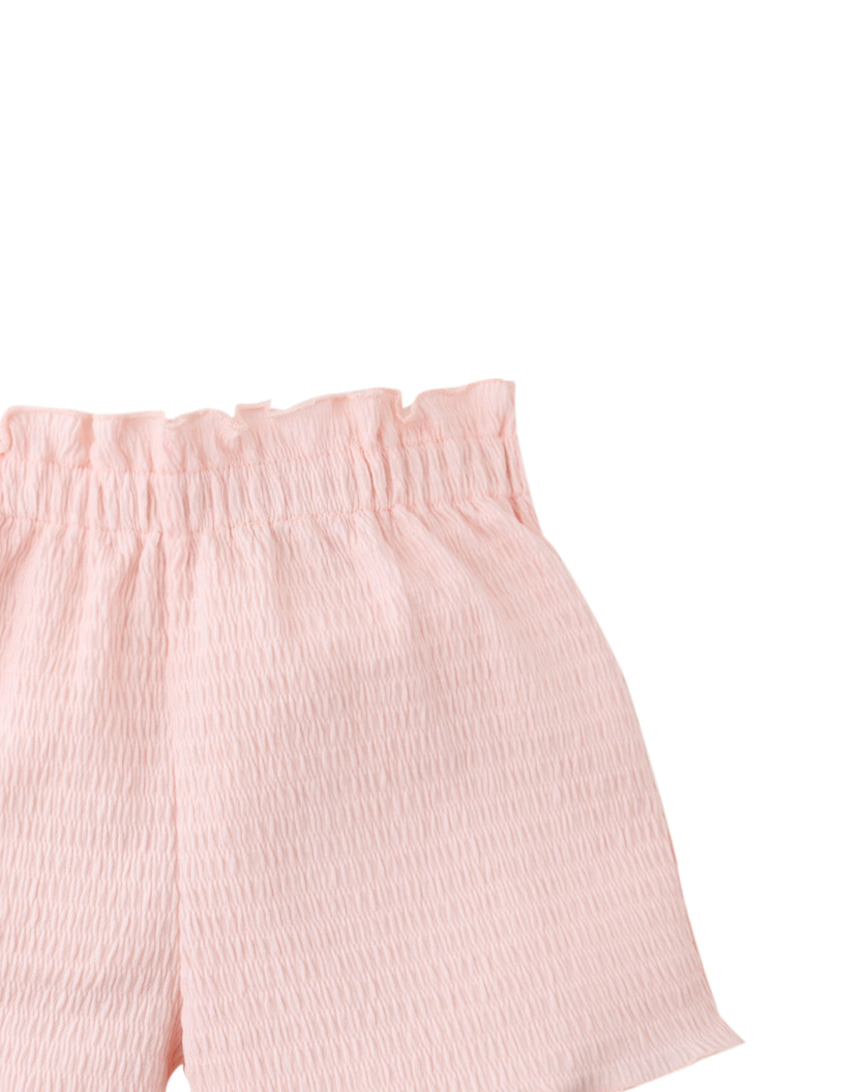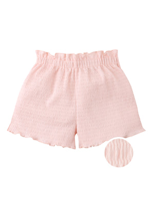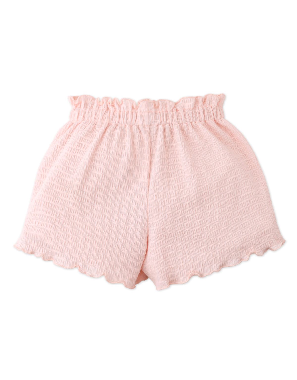 Keep her cool on warm days with these playful smocked shorts in pink or off-white, designed with a stretchy fit and cheerful paperbag waist.