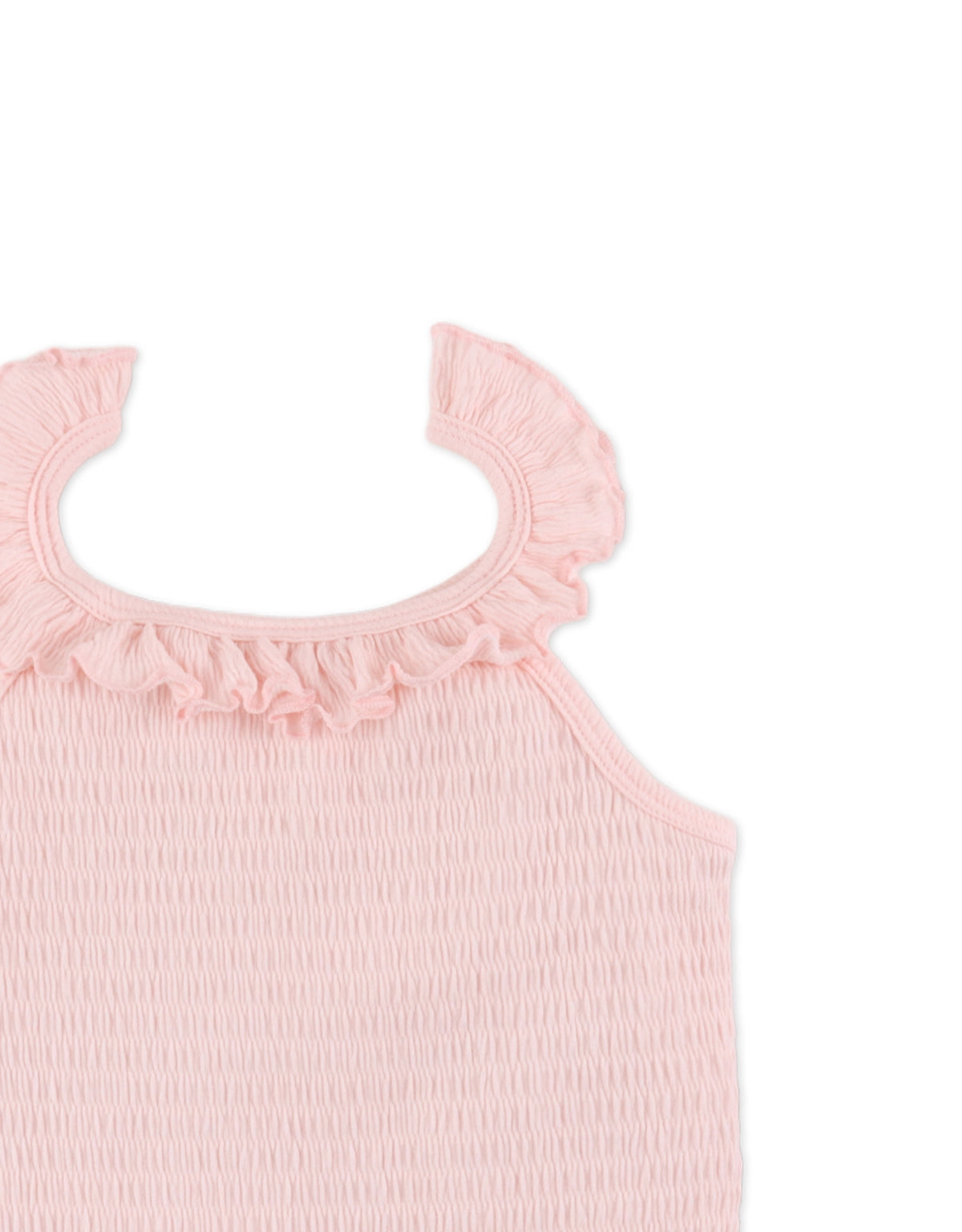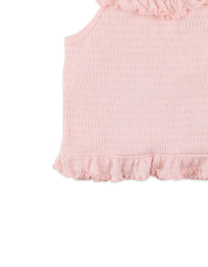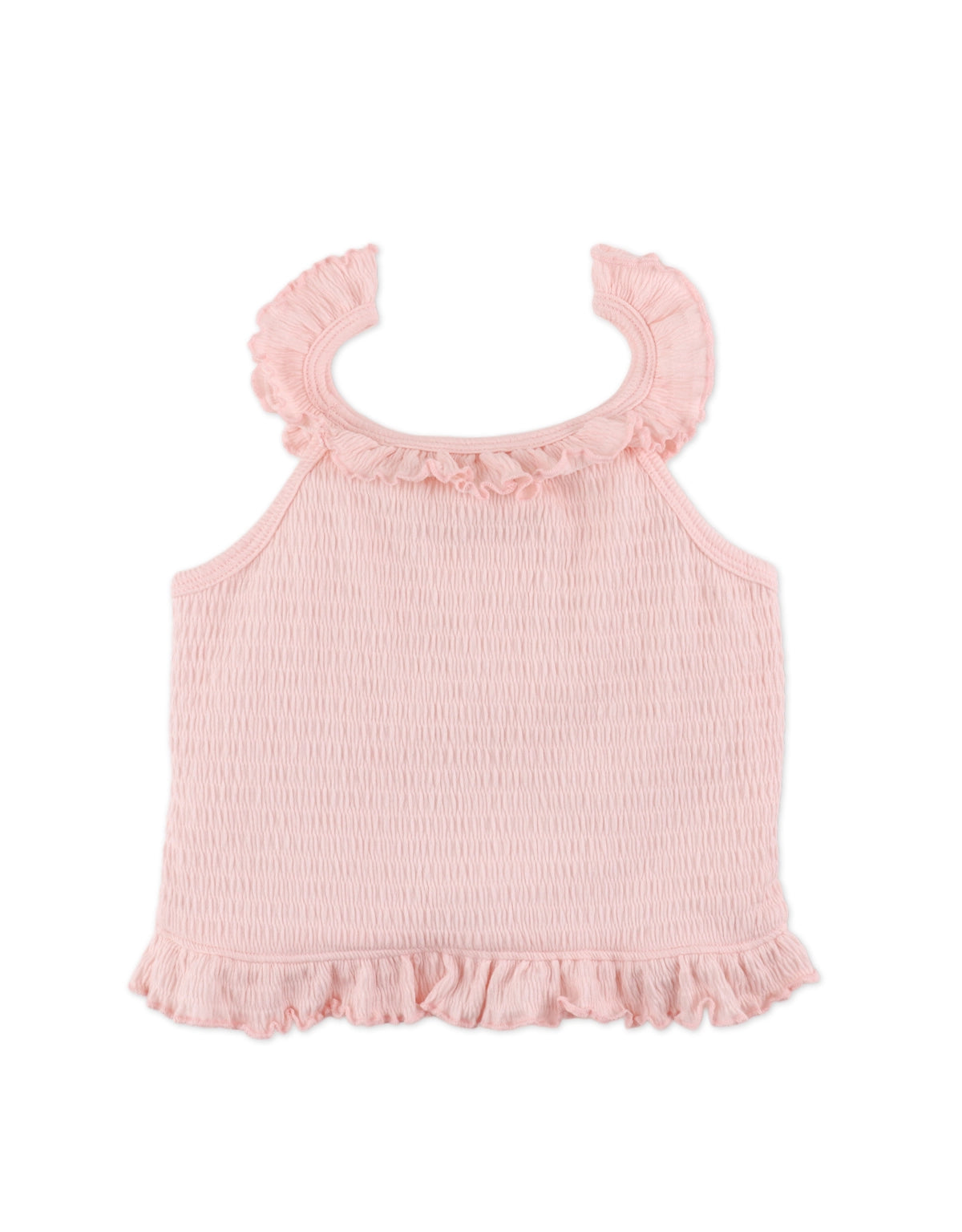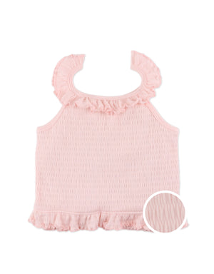 Brighten her sunny days with this breezy smocked top, available in pink and off-white, then finished with strappy sleeves and delicate ruffles for a touch of adorableness. It is available in pink or in off-white.