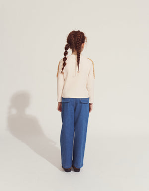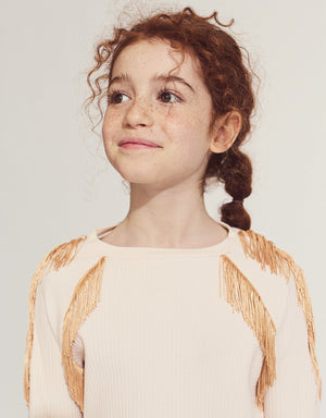 Add a touch of playful charm to your little one's wardrobe with the Therese Long Sleeves Top in Eggnog, featuring contrast fringe accents for a fun, stylish look
